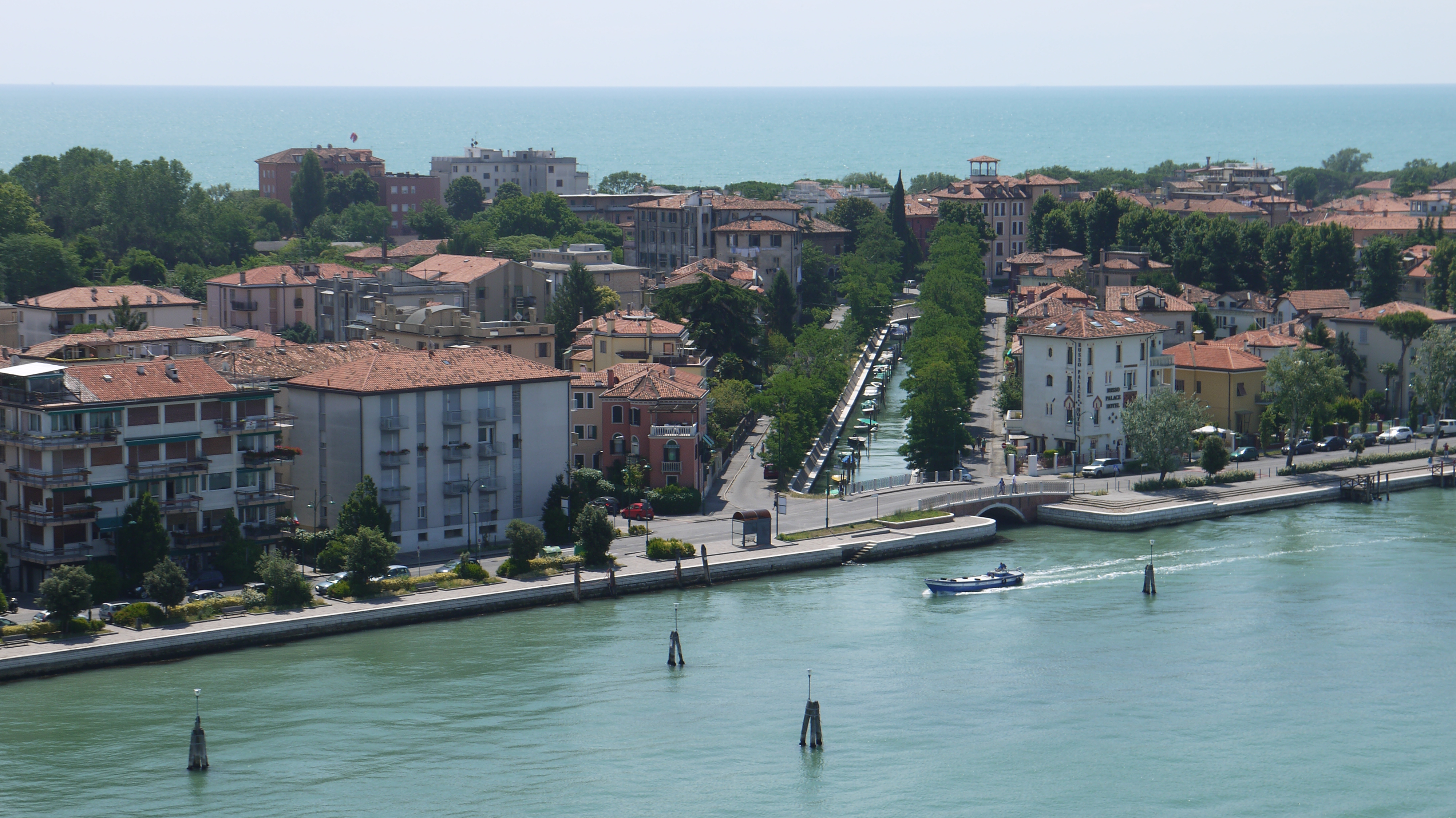 Venice is built on an archipelago of 117 islands formed by 177 canals in a shallow lagoon, connected by 409 bridges. In the old centre, the canals serve the function of roads, and almost every form of transport is on water or on foot. In the 19th century, a causeway to the mainland brought the Venezia Santa Lucia railway station to Venice, and the Ponte della Libertà road causeway and parking facilities (in Tronchetto island and in piazzale Roma) were built during the 20th century. Beyond the road and rail land entrances at the northern edge of the city, transportation within the city remains (as it was in centuries past) entirely on water or on foot. Venice is Europe’s largest urban car-free area. Venice is unique in Europe, in having remained a sizable functioning city in the 21st century entirely without motorcars or trucks.