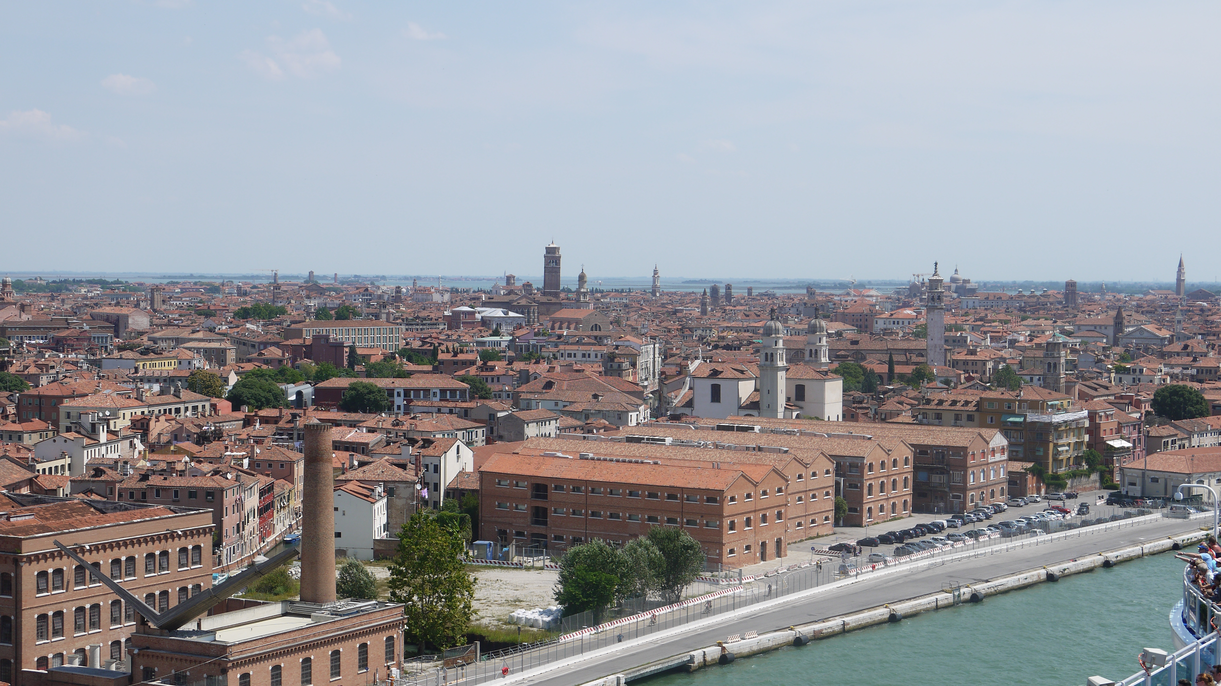 If we were on a plane I would say we started our descent into Venice at about 11am yesterday. It is quite a process entering into a waterway like the one in Venice. Due to the fact that Venice sits very low on the water table and is prone to flooding they are building some breakwaters as you enter Venice. The captain referred to them as roadworks. Once we passed the “roadworks” in the Venetian Lagoon the boat entered the Grand Canal. It is quite a spectacular experience standing on top of the cruise ship entering Venice. The boat passes Piazza San Marco before making it’s final approach to berth at Bacino di Marittima.