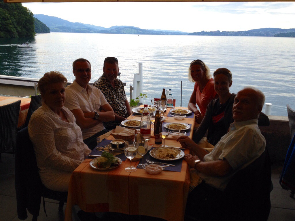 A suggestion was made to go and have dessert across the other side of the lake – why not – a new style of progressive dinner but by boat! All aboard for another relaxing boat trip on the lake – Steve even did a bit of driving. We stopped in the middle of the lake where you could see a lot of the arms of Lake Lucerne and Elvis’s father got the lake map out to explain what was what.