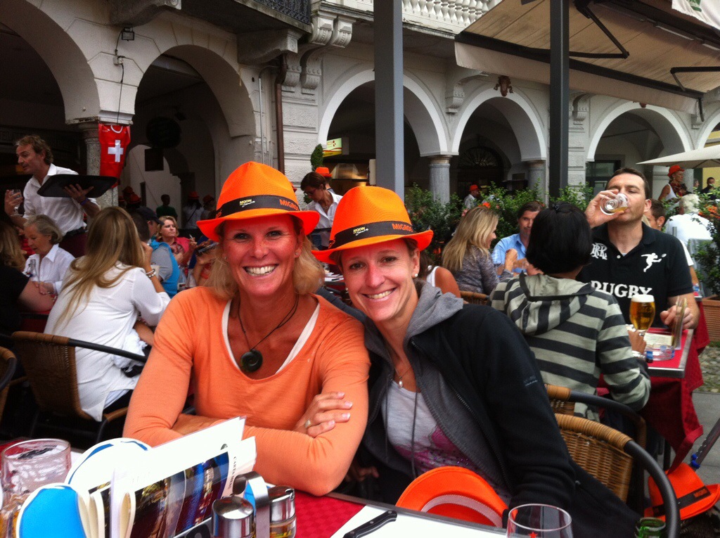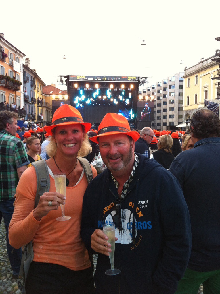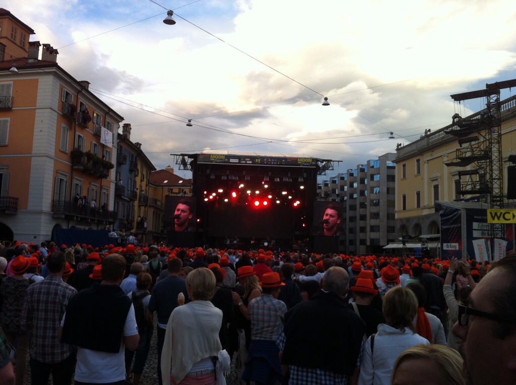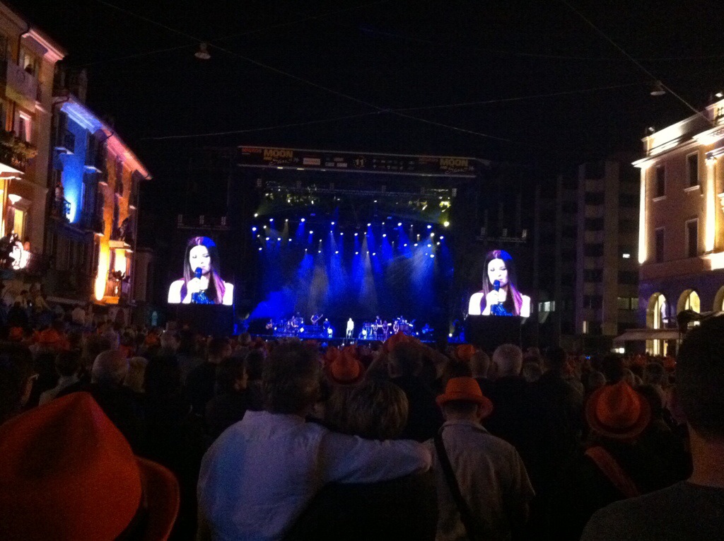 The concert we came to see was that of Laura Pausini. The support act was a Swiss singer called Bastian Baker. The concert was being held in the Piazza and we managed to get a table for dinner in one of the restaurants inside the Piazza. It was Italian Pizza all round – yum! We then joined the rest of the concert goers in the middle of the Piazza. Migros which is a large supermarket chain over here sponsor the Moon & Stars Festival which is held every year in the Piazza. Also featuring this year are Dolly Parton, James Blunt, Backstreet Boys and Jack Johnson. The orange hats you see in the photo are courtesy of Migros.