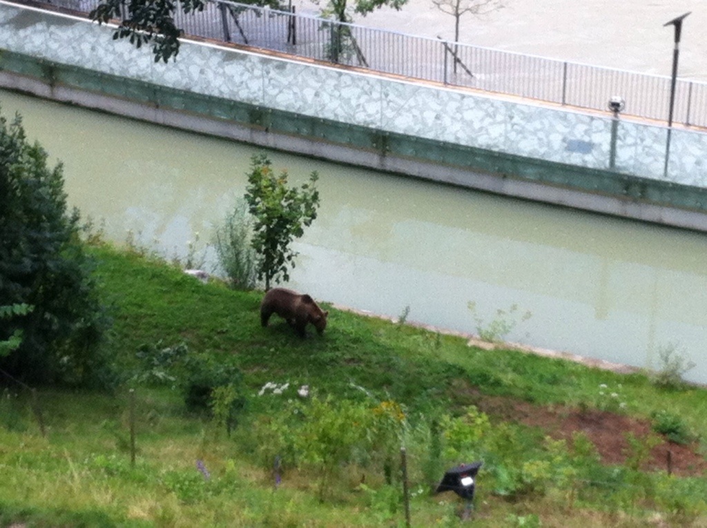 The original bear pit is a concrete hole in the ground filled with big stones and very little vegetation – not the best environment for the bears. The new open air enclosure is much better with lots of trees and is on the edge of the river. We managed to spot one of the bears in there. When we returned later on they had moved two of the bears to the old bear pit so you could see them closer up.