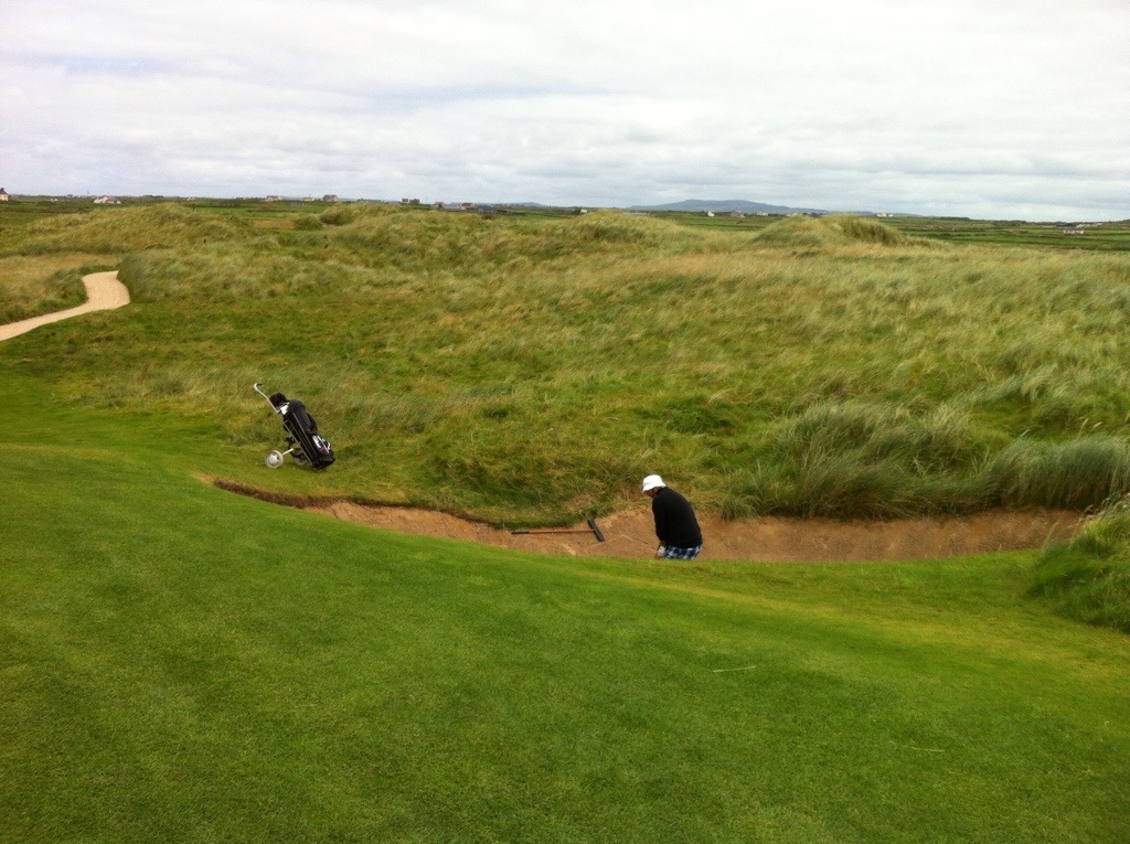 The first nine holes go out along the coast and the second come back inland. We were just teeing off on the third when this woman walked towards us heading for the 16th. I thought ‘she looks familiar’ but thought no it can’t be. We said hello and she asked if she was going in the right direction for the next hole, all the while we were all looking at each other thinking we were familiar. It turns out it was our Canadian friend Trish who we know through an ex Manukau Golf Club member that Steve met at the World Junior’s in San Diego. Her and James run golf tours all around the world so she was out checking out the lodge and course. It turns out James is also in Ireland with a tour group playing all the great golf courses Ireland has to offer. What a coincidence – if we had been 5 minutes earlier or later we would have missed seeing each other. It was great to see her and catch up on the news.
