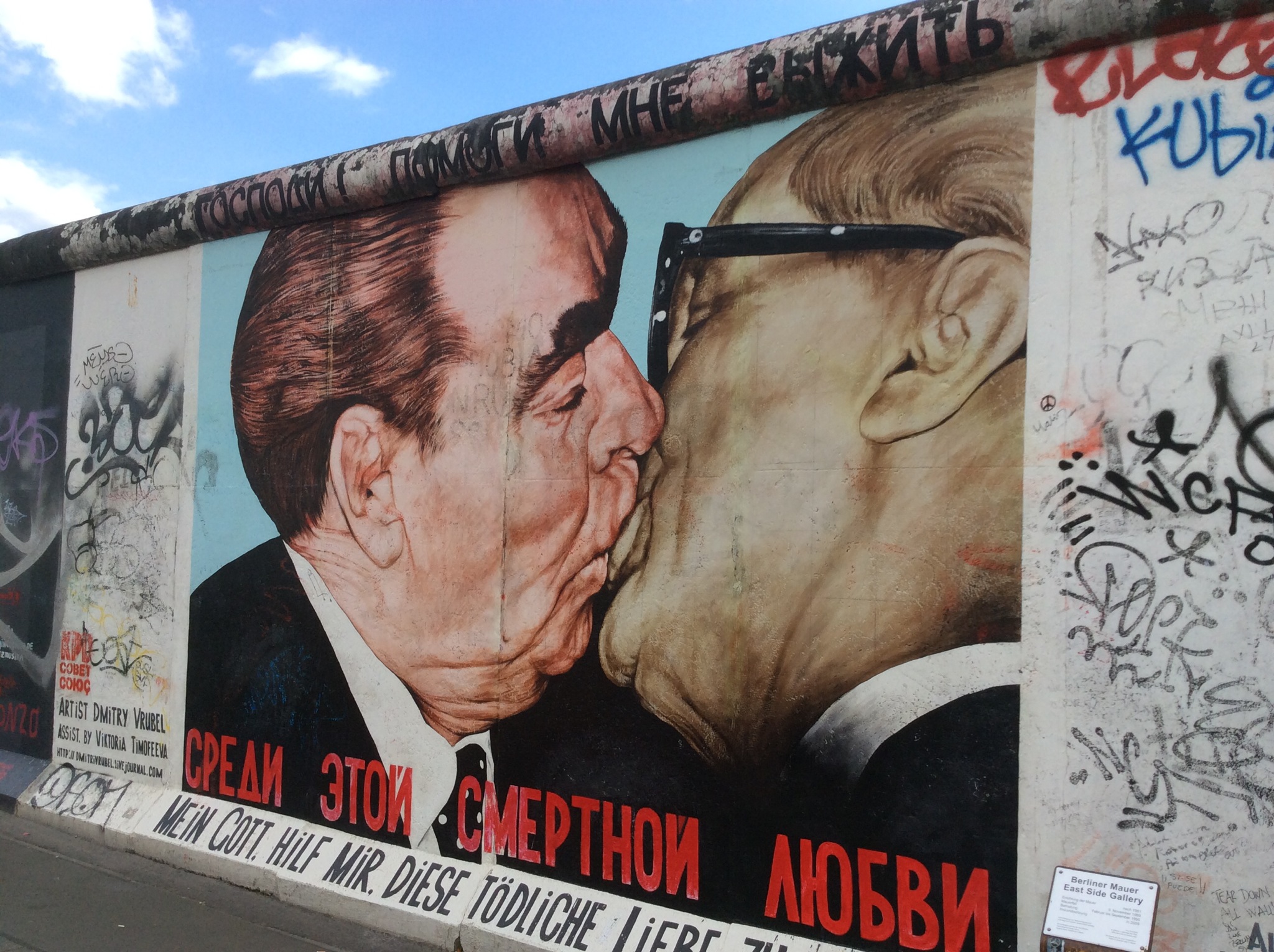 The fraternal kiss became famous via Erich Honecker and Leonid Brezhnev, who were photographed exercising the ritual. The photograph became widespread and it was subsequently transformed into a graffiti painting on the Berlin Wall named My God, Help Me to Survive This Deadly Love.