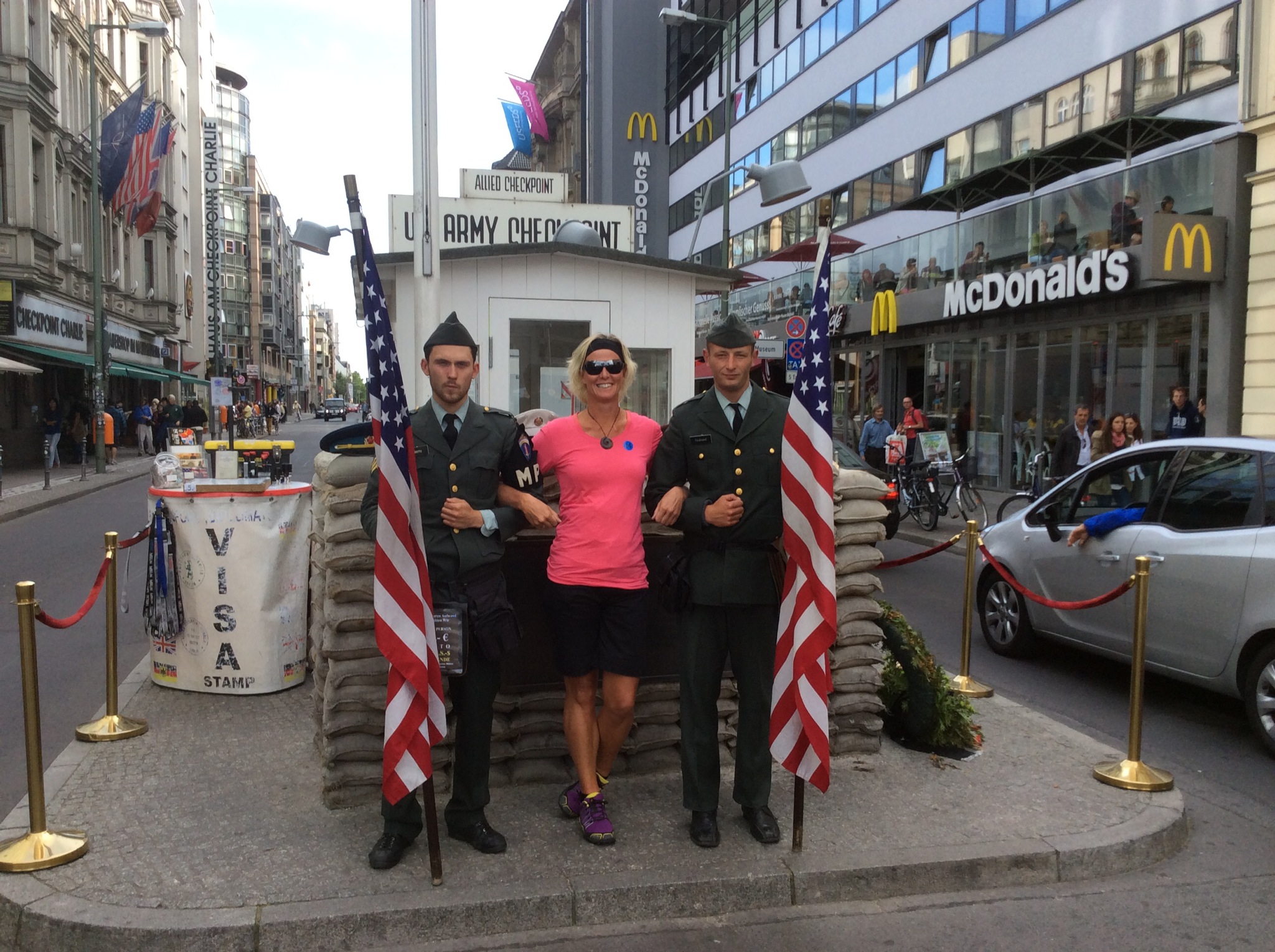 We stopped at Checkpoint Charlie which sat in the middle of the Russian, French, American and British quarters. It was the checkpoint you went through from East to West. The Russian and American tanks sat facing each other about 50 metres apart. It is quite a tourist attraction now and they have these “soldiers” standing there with American flags – you can have your photo taken with them for EU2 per person. It was a bit tacky really but it had to be done.