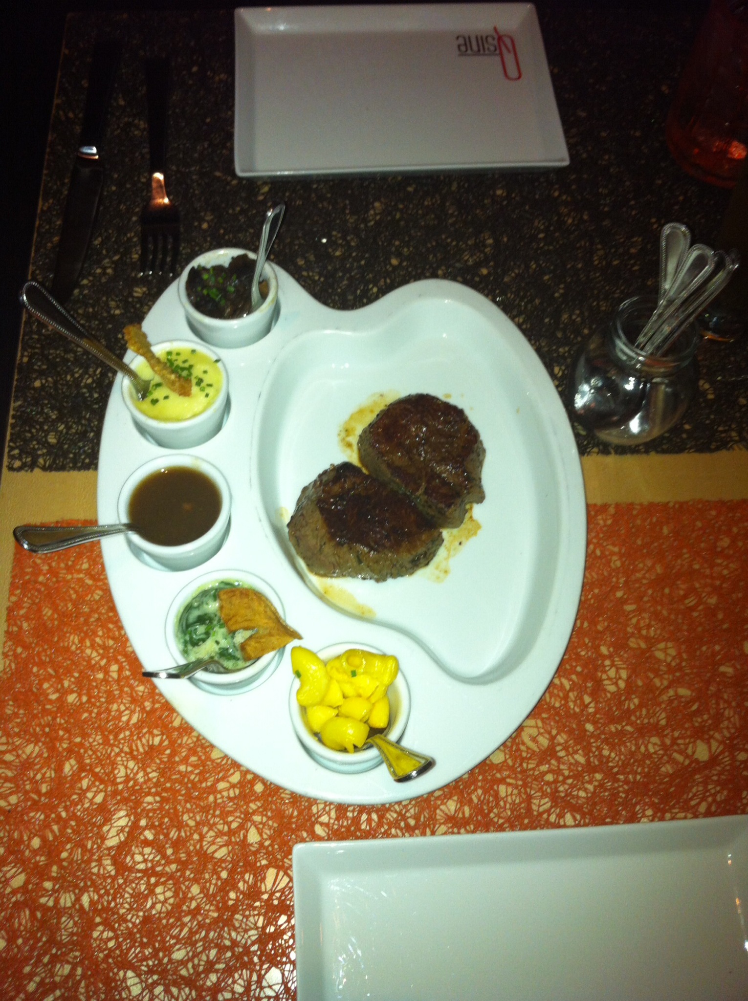 We had spring rolls that turn up in springs, a Chinese medley which turned up in martini glasses with no stems, filet mignon presented on a painters palate with all the accompaniments ready to be painted on your steak. The steak was gorgeous and trust me we know our steak. The beef tacos come with all the ingredients to make your own guacamole and you can even make your own mojito.