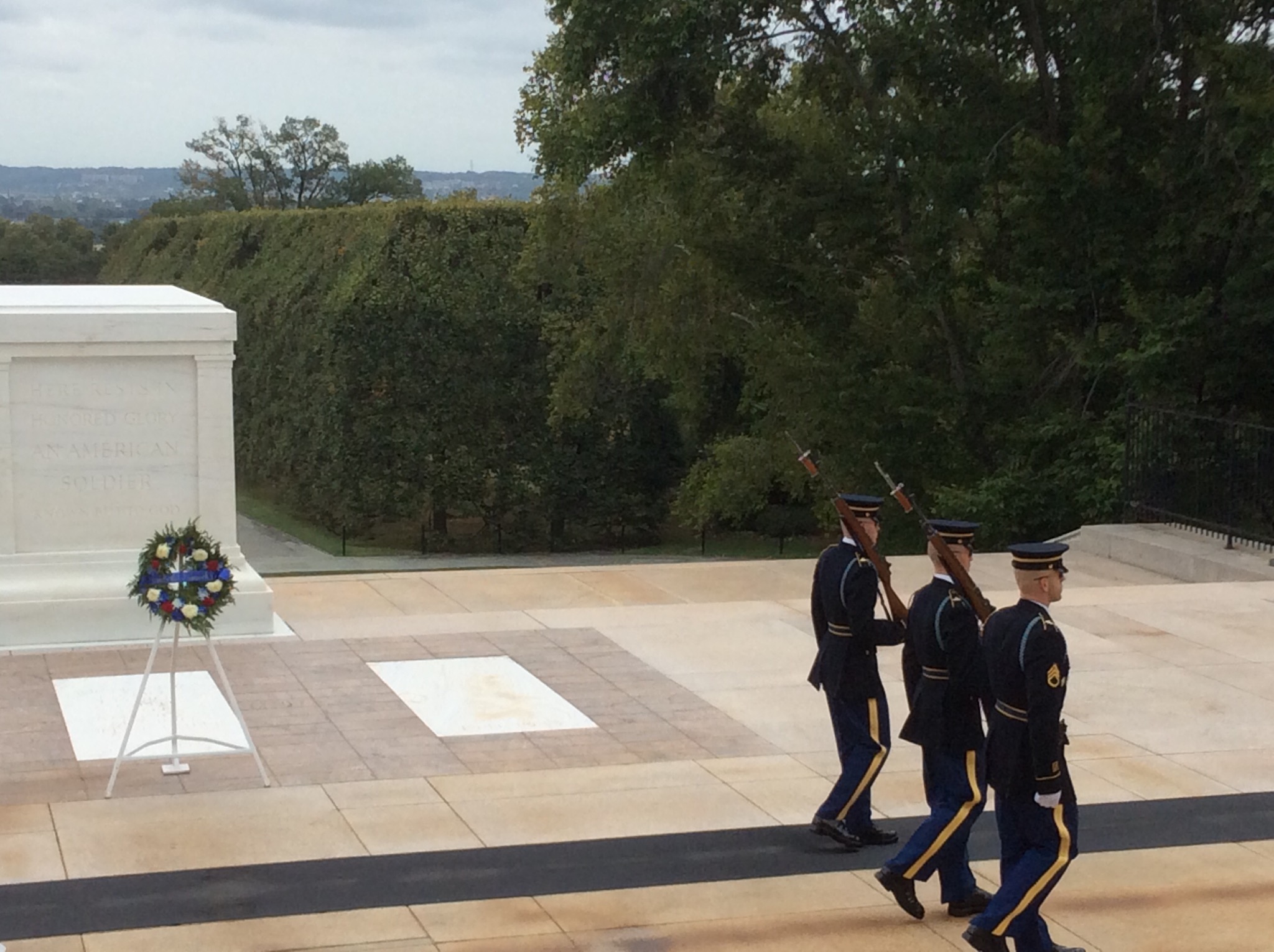 We went to see the Tomb of the Unknowns and saw the changing of the guard. The Tomb of the Unknowns has been perpetually guarded since July 2, 1937, by the U.S. Army. The 3rd U.S. Infantry Regiment (“The Old Guard”) began guarding the Tomb on April 6, 1948. There is a meticulous routine which the guard follows when watching over the graves. The Tomb Guard: