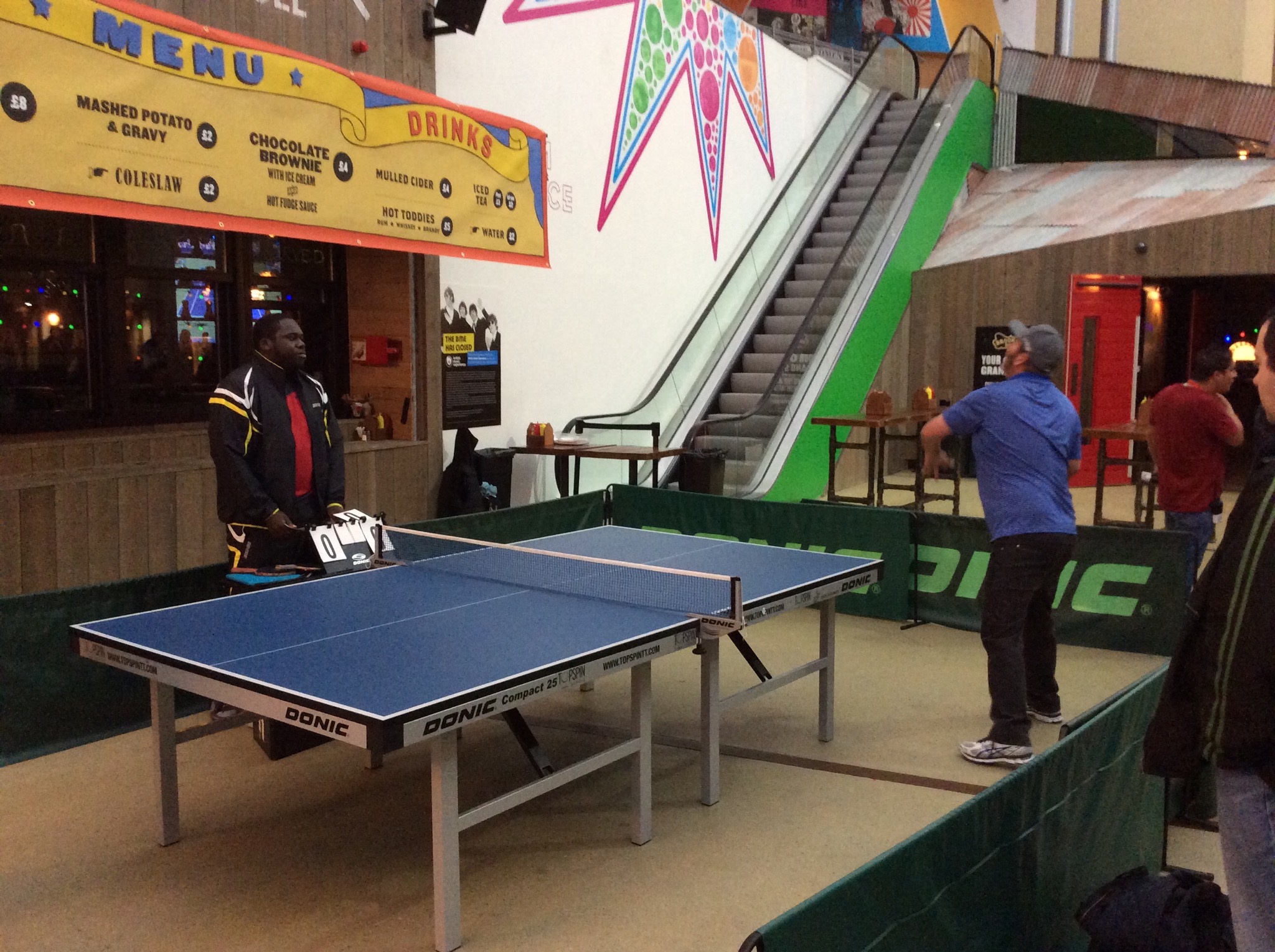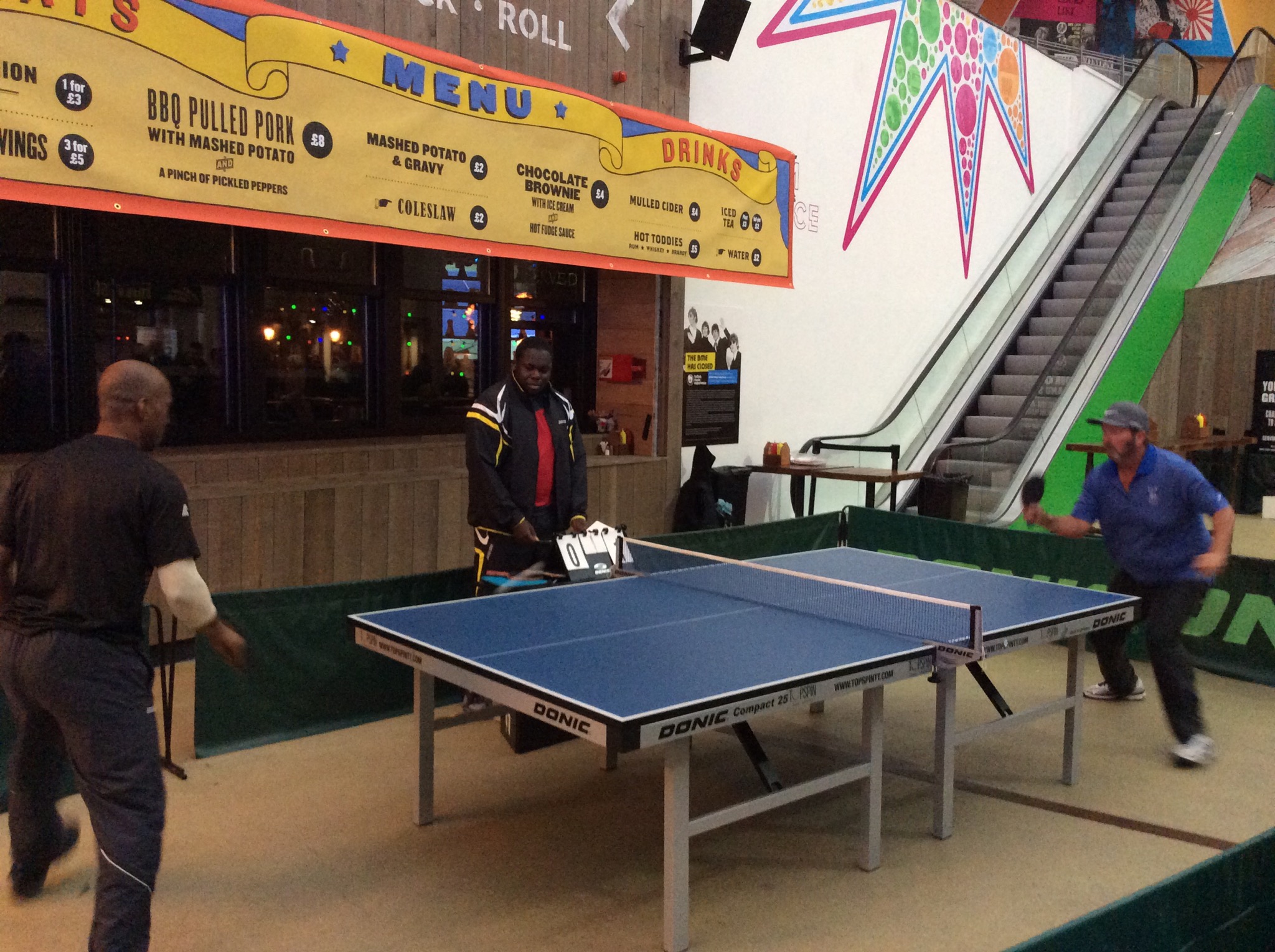 Along the way Steve discovered some table tennis going on – you could play against an English professional and if you got any points against the professional you won tickets to go ten pin bowling. Steve couldn’t resist – you could tell he was thinking I can take this guy! He put his name down and after a few minutes it was his turn – he looked good but only managed 1 point – note the games were only up to 3. He then put his name down and again only managed 1 point. I had to drag him away to go and find our seats.