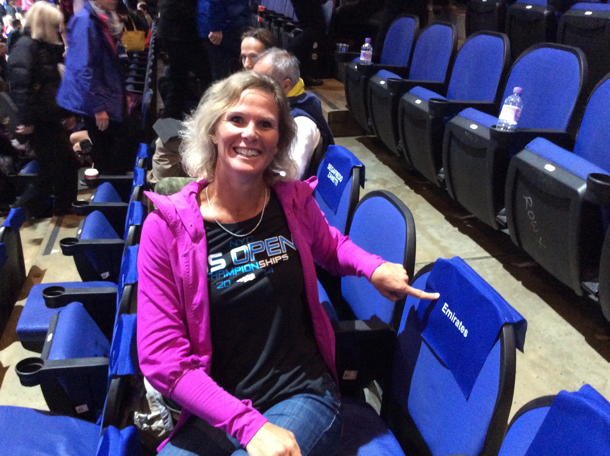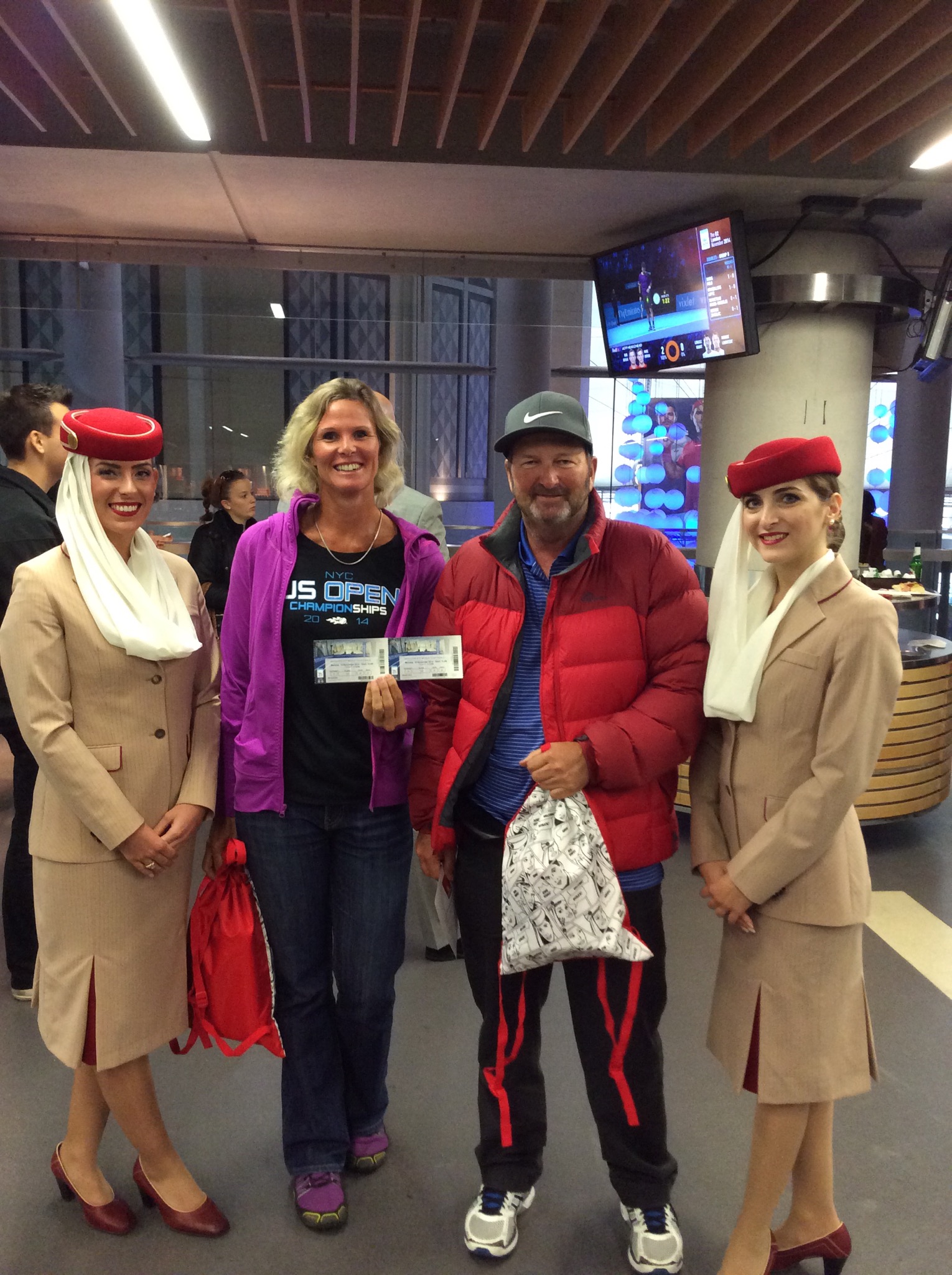 Two ladies from Emirates then appeared and presented us with our prize and a goodies bag. We had won seats in the lower level to watch the upcoming singles match. They took us in and got us seated – we were half way up the first level on the net line – not bad.
