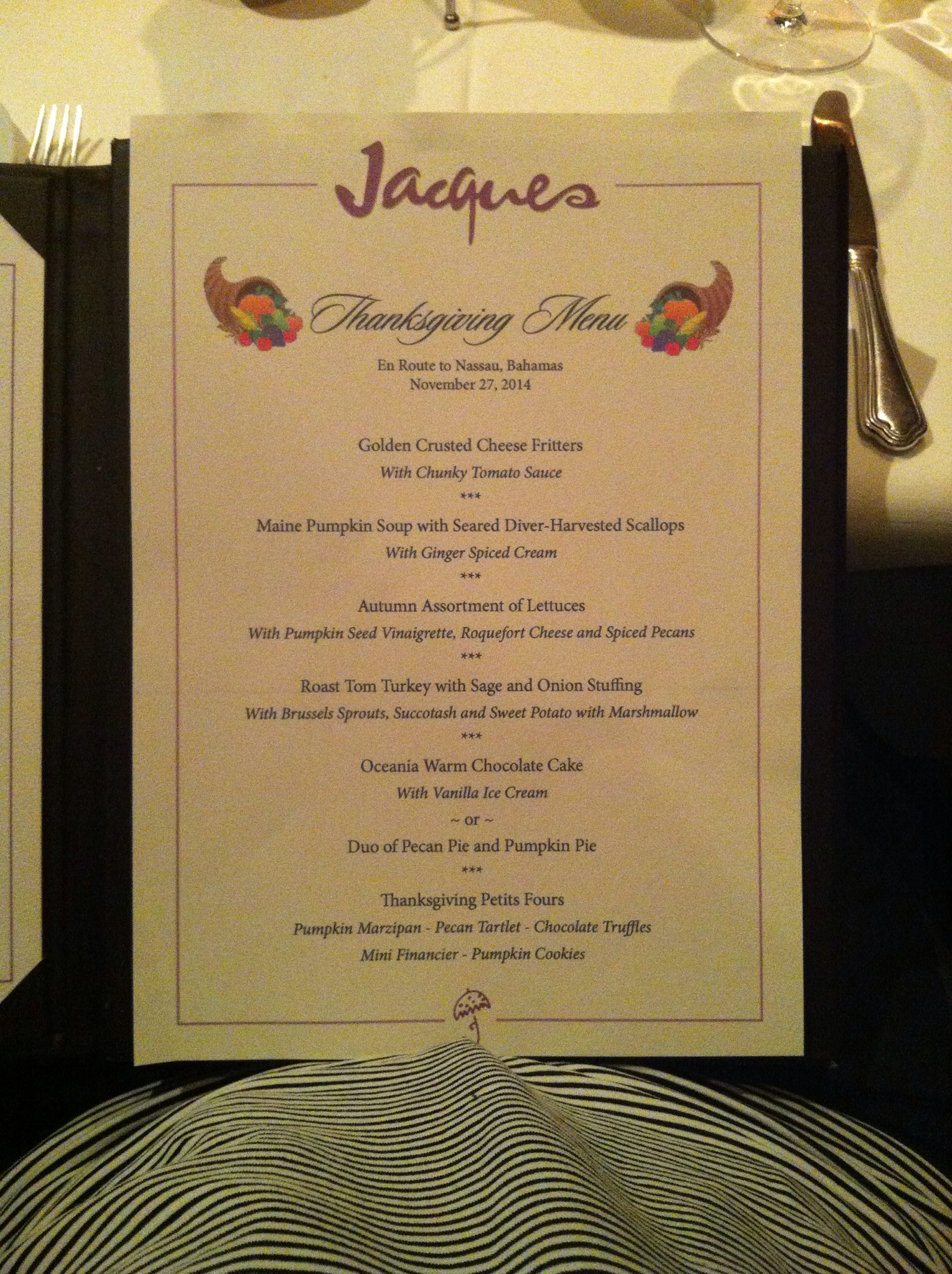 Today is Thursday November the 27th – Thanksgiving Day and we are back on the Atlantic enroute to the Bahamas. There are a lot of Americans on the ship so there has been a lot of talk about Thanksgiving. I have never really understood what Thanksgiving is all about so thanks to the daily bulletin put out by Oceania I now understand:
