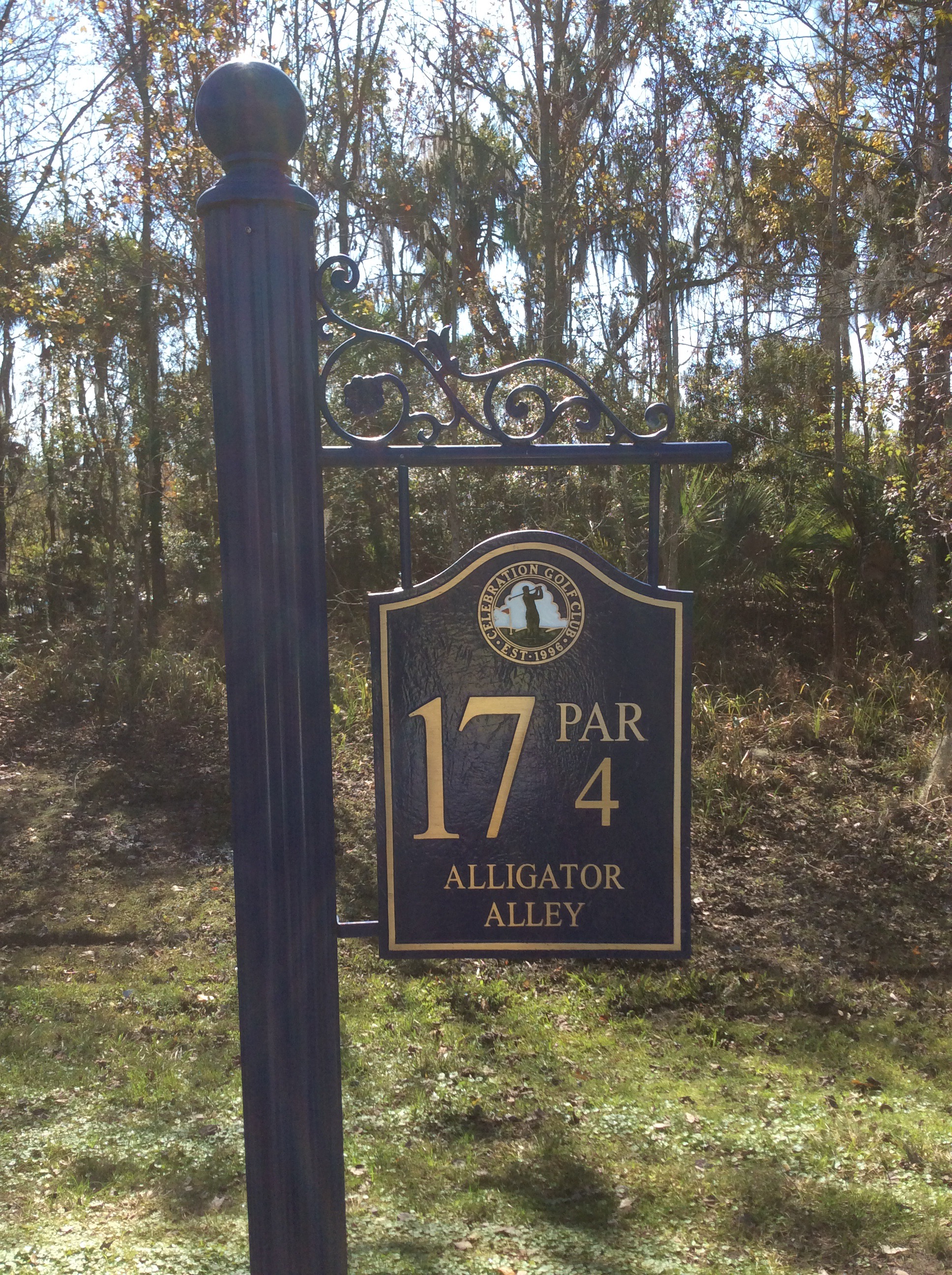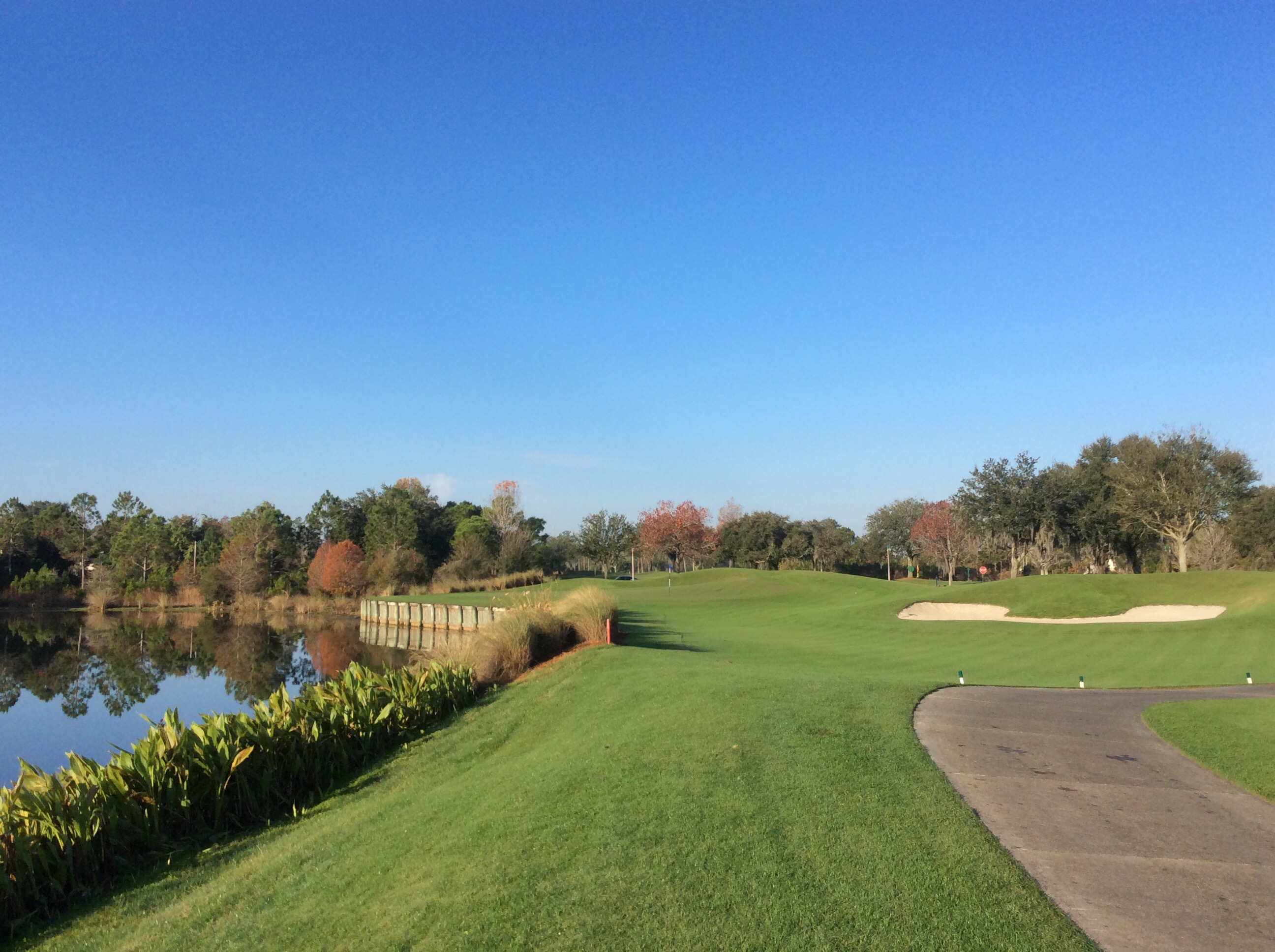 We were paired with a couple of guys – Jim who lives in Connecticut but has a house in Celebration and Peter who lives in Celebration. It is always good to have some local knowledge when playing a course for the first time. The course was very well manicured and quite a few of the holes had water on them. I boned my ball out of the bunker on the seventh and it went into a lake. I wandered over to have a look and Jim & Peter pointed out the alligator sunning itself just on the edge of the lake. I decided I really didn’t like that ball very much after all. We saw two more alligators around the course after that. The seventeenth hole is called Alligator Alley – we took extra care on that hole!