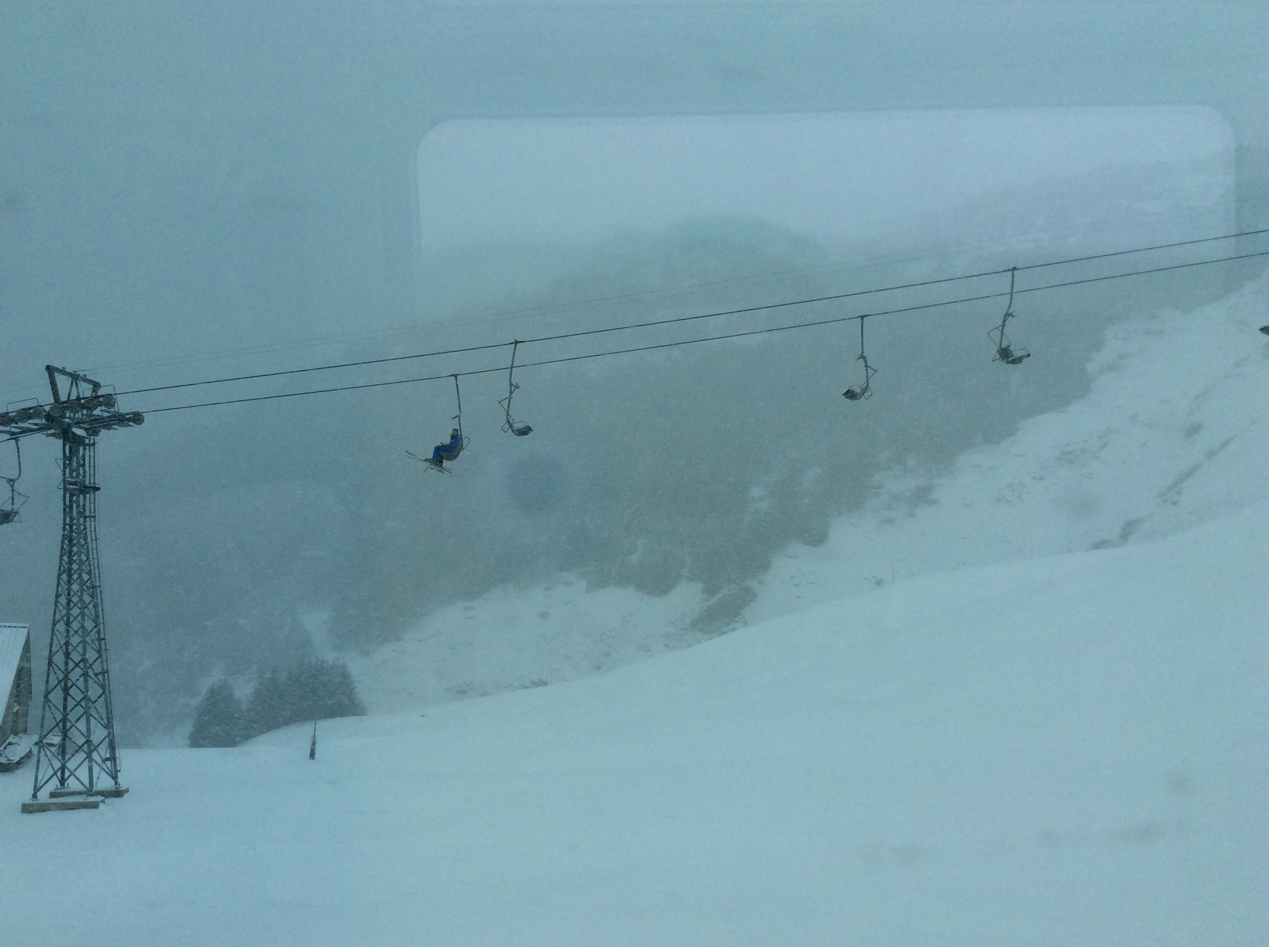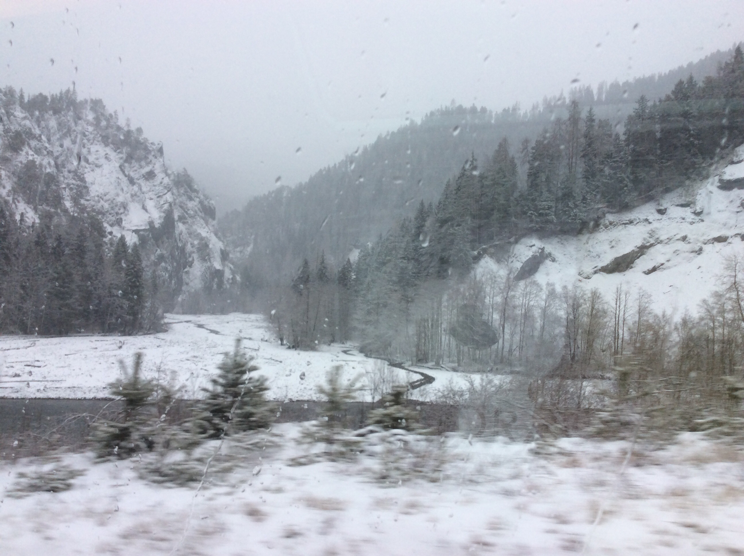 After leaving Chur where a few more people joined the train we started the climb up the Rhine Valley to the Oberalp Pass which is the highest point on the Glacier Express at 2.033 metres. The landscape looks very dramatic in the Rhine gorge between Reichenau and Ilanz, where the river is carved deep into the white rocks. This region is also referred to as the ‘Swiss Grand Canyon’. It was snowing as we climbed up the Rhine Valley and it was completely white outside – we saw a few hardy souls out skiing. We then descended down to Andermatt where we got off the train.
