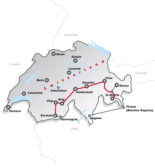 The Glacier Express is an express train connecting railway stations of the two major mountain resorts of St. Moritz and Zermatt in the Swiss Alps. The train is operated jointly by the Matterhorn Gotthard Bahn (MGB) and Rhaetian Railway (RhB). For much of its journey, it also passes along and through the World Heritage Site known as the Rhaetian Railway in the Albula / Bernina Landscapes.