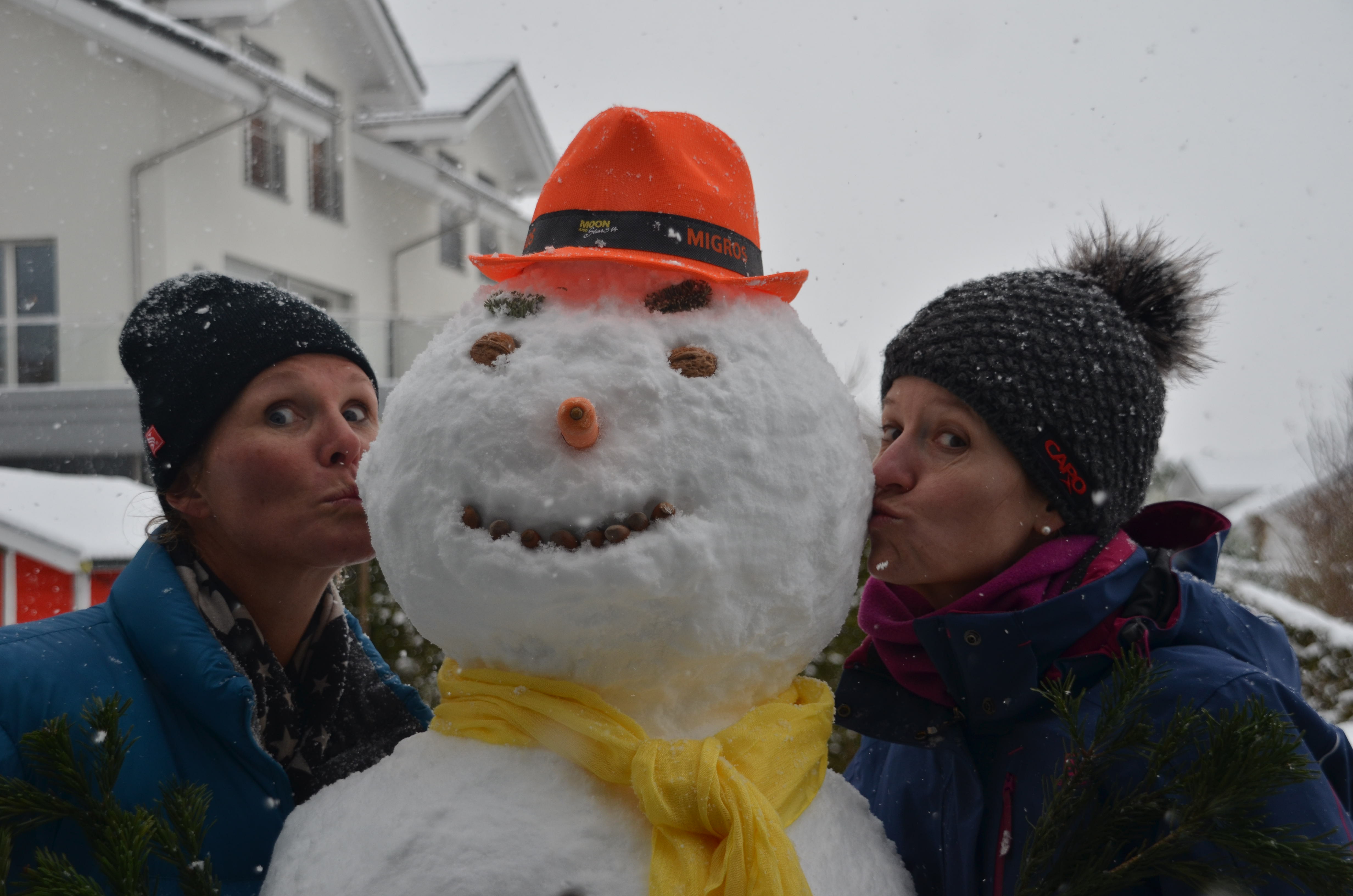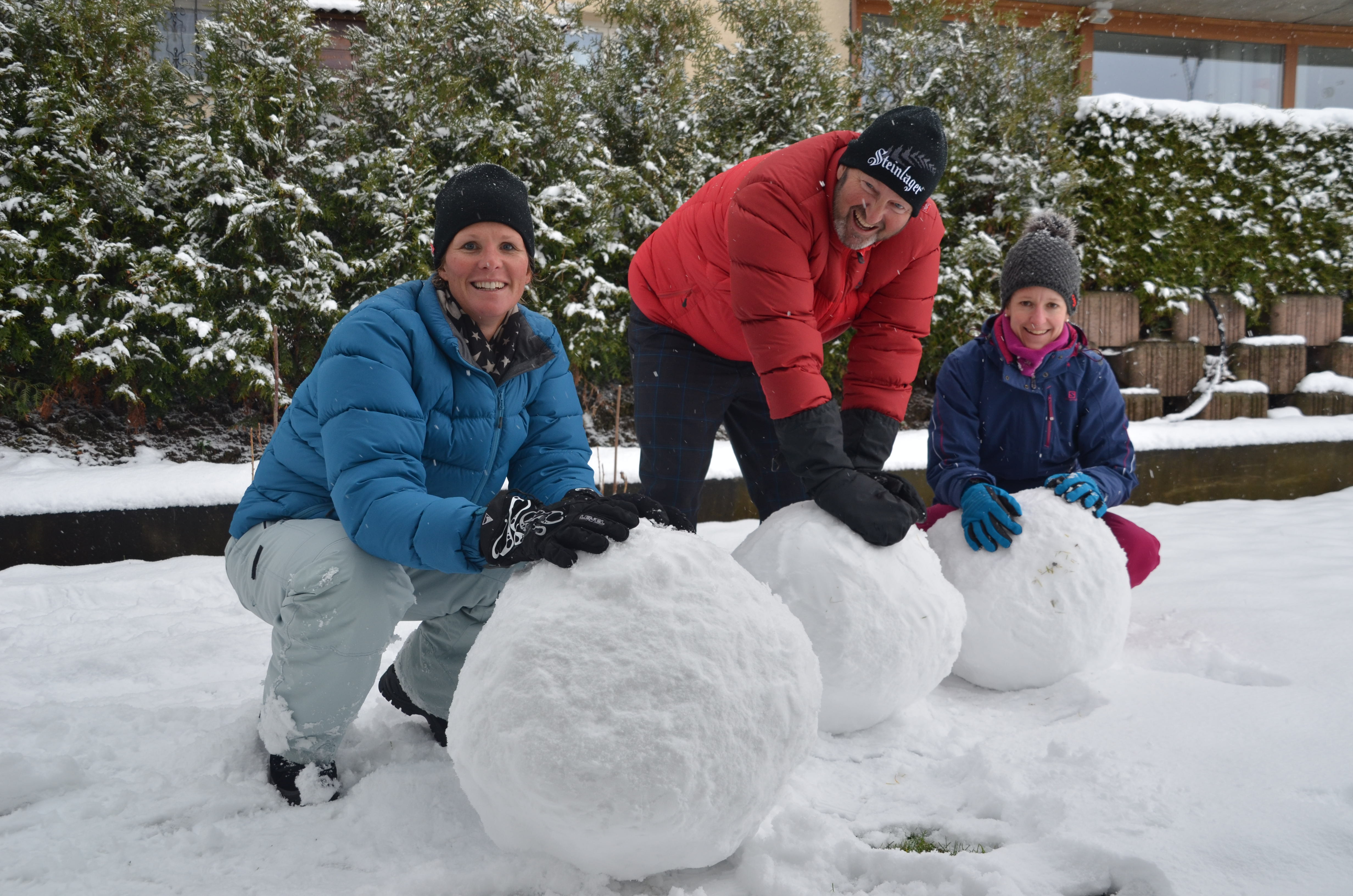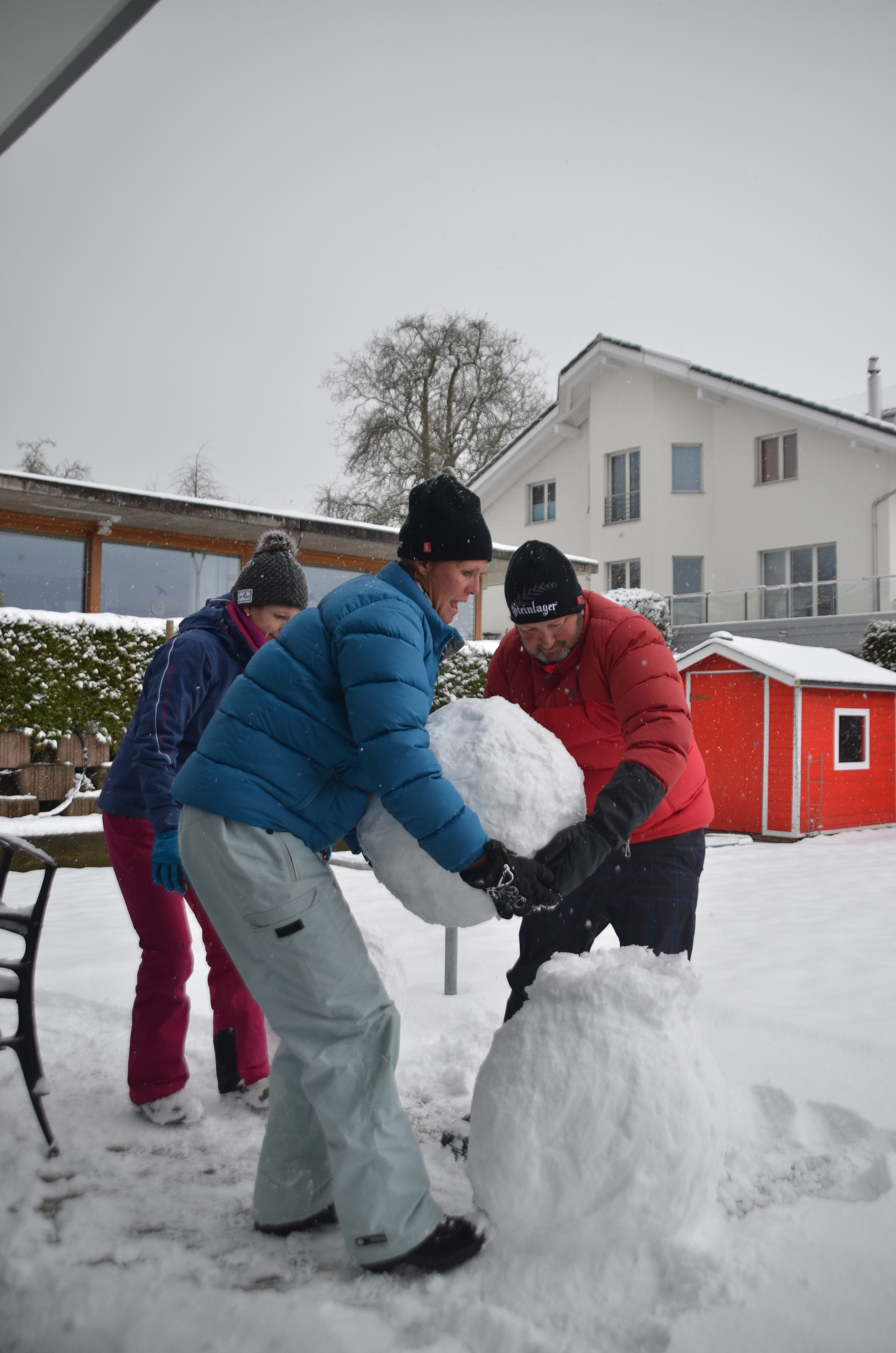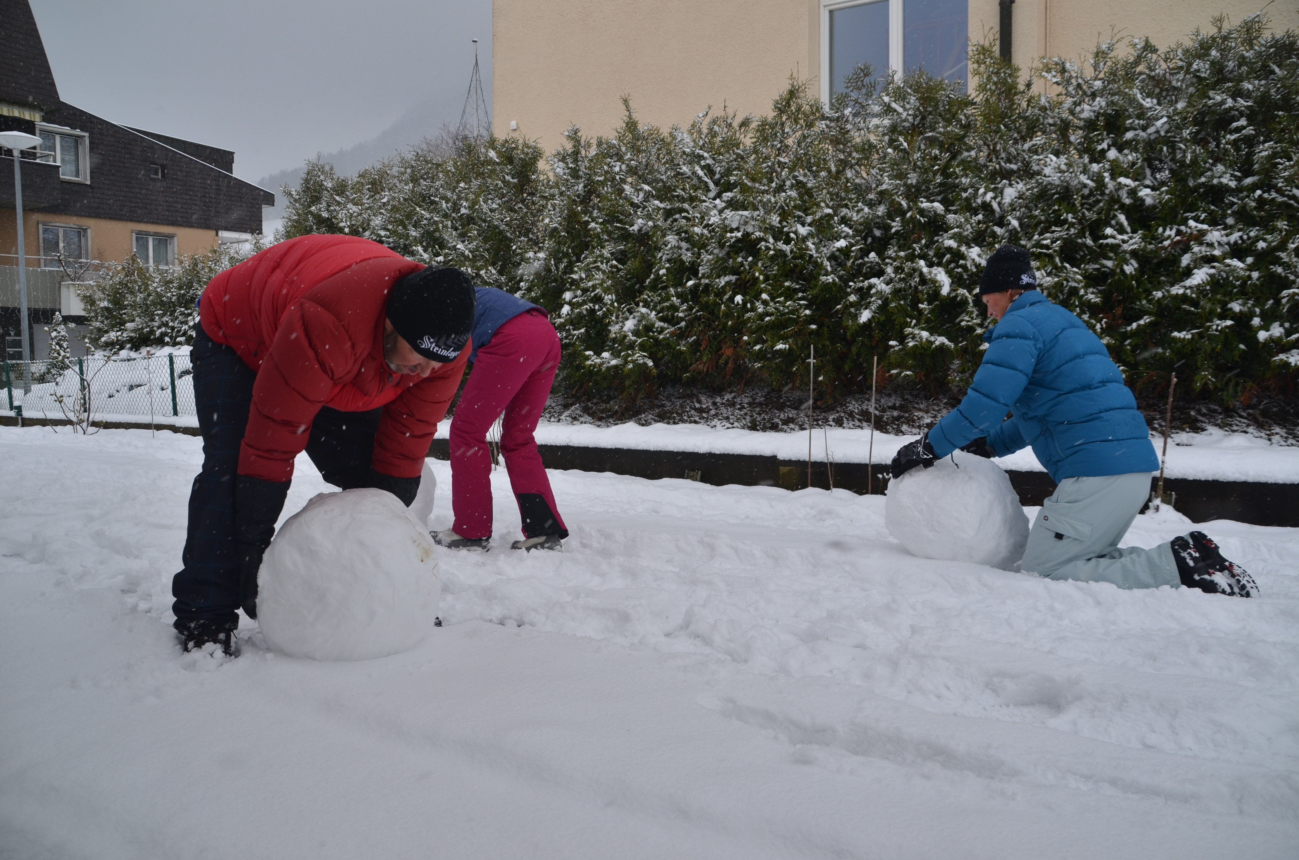 Next up on the agenda was building a snowman. I have only ever built one snowman in my life and that was back at the end of 1996 in Germany with my step sister Carey. I don’t remember the exact technique we used back then but it probably wasn’t up to Swiss standards : ) Karin showed us the Swiss technique of starting with a ball and then rolling it through the snow compacting it as you go. The ball gets bigger and bigger. We ended up with three rather large balls so decided our snowman was going to be tall. Karin made a smaller ball for the head. We then assembled the 4 balls and dressed the snowman appropriately. The hat we put on him was from Migros so we named him Mr Mi. By this stage Steve was inside with Elvis who had been documenting the building of Mr Mi on his camera. The boys thought Mr Mi was on a slight lean so we had to do some remedial work to make sure he was standing tall.