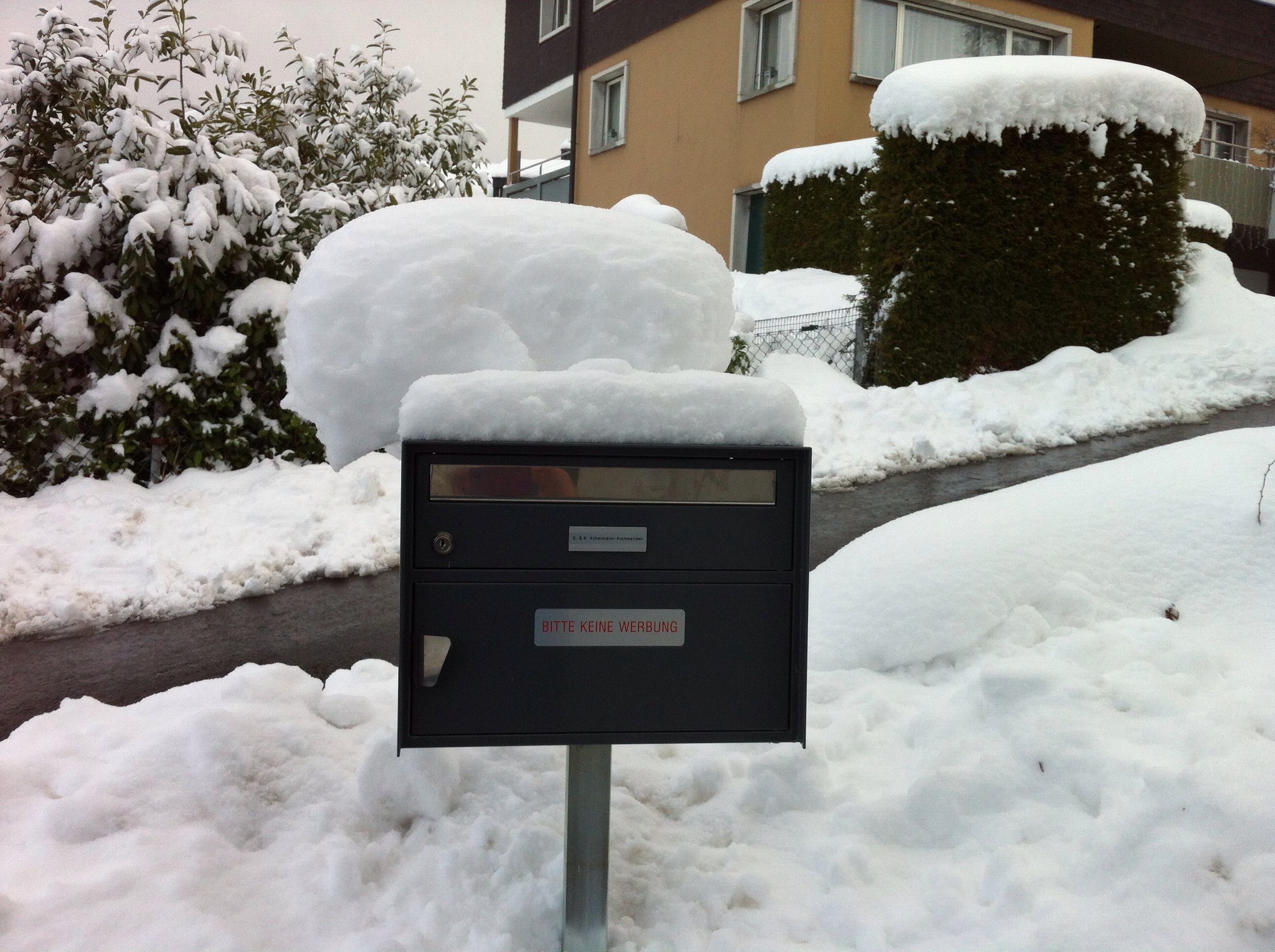 After our night out in Lucerne we had ended up pushing the car up the driveway and after coming back from the Landerpark we had only managed to push it half way up to a parking spot there. However, there was no way we could push it up that night. You can see from the two letterbox photos and Mr Mi how much snow we had had.