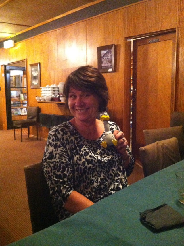 The lakeside track meets up with Lake Ohau Road 10km before the Lodge which was our accommodation for the night. The wind seems to get up in the afternoon so we had a head wind to the Lodge which was a bit challenging for everyone. The Lodge driveway was a welcome sight even though you still have about 500m of a gentle uphill to reach the Lodge itself. We had a great meal at the Lodge and lots of laughs with the daily fine session. Raewyn had fallen off her bike just before Twizel and Roberta had admitted to mistaking the Deep Heat for her toothpaste! Roberta was awarded Duckhead our Dick of the Day award : ) Paul felt the need to give Murray a call to let him know about Roberta’s antics!