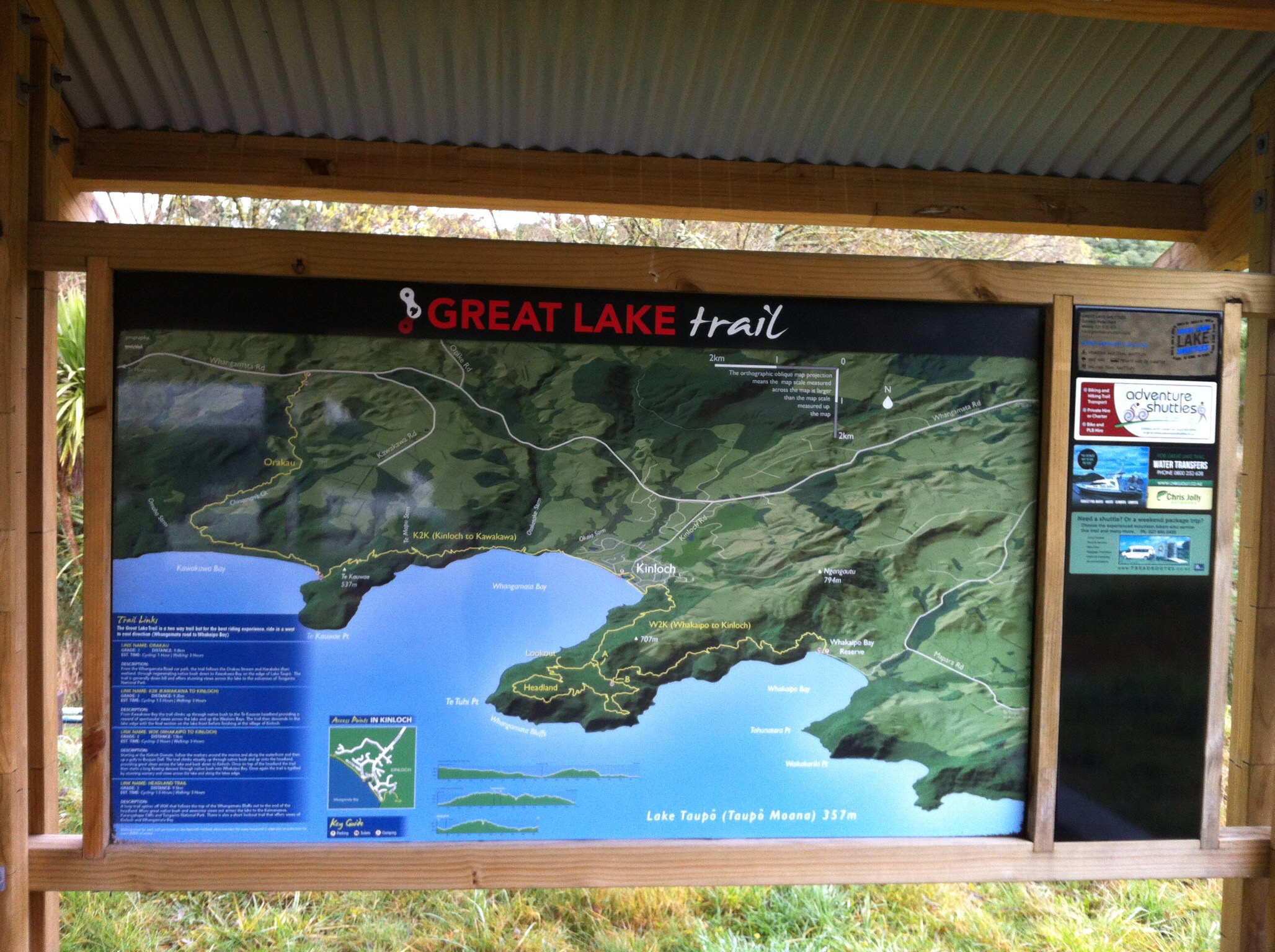 The 71km Great Lake Trail is a grade 3 trail composed of six links (trails) which can be broken down into three sections. On the western side of Lake Taupo is a 30 km section (Waihora & Waihaha links) and on the northern side is a further 41 km of track in two sections (Orakau & K2K links and the W2K & Headland links). The shelter on the Kinloch Domain has a large map and can be the starting point for W2K (Whakaipo to Kinloch) and K2K (Kinlock to Kawakawa) tracks. There is no link between the end of the Waihora link (Kotukutuku Stream in Waihora Bay) and Orakau or K2K links. A boat transfer is required to get between these areas or back to Kinloch. The Great Lake Trail is a two way trail but for the best riding or walking experience, ride or walk in a west to east direction. Cycle the whole track in two or three days or break it up and choose the sections/links you want to enjoy. The trail can be used year round as the free draining pumice soil surface means that even in wet weather there is little or no mud.