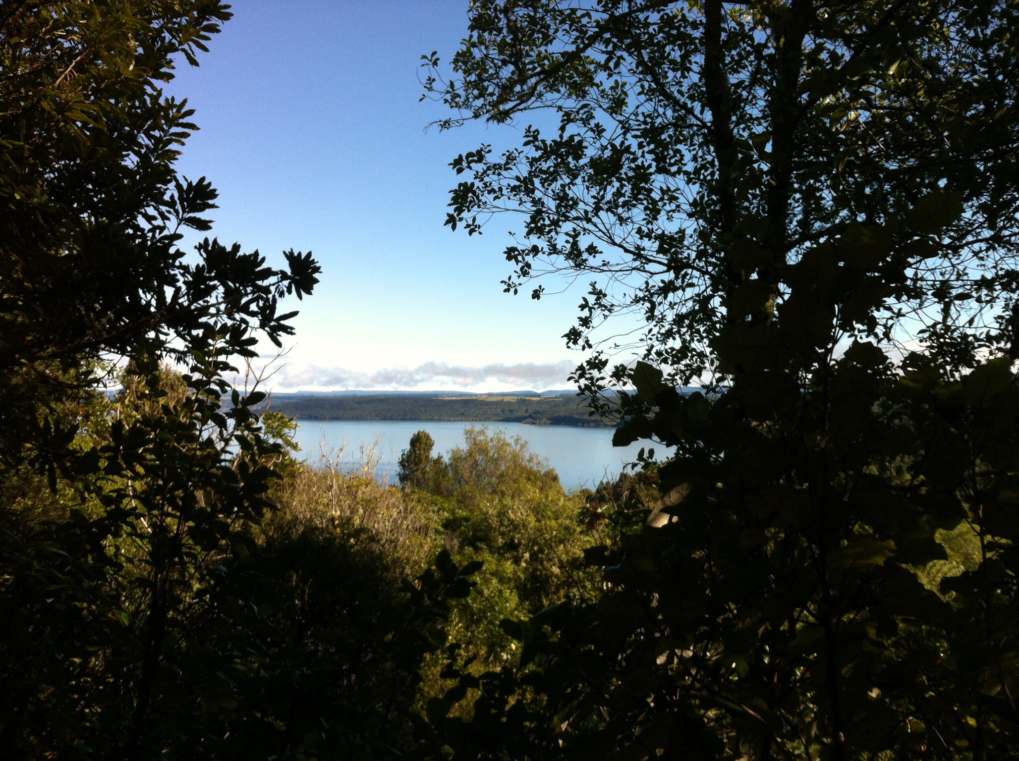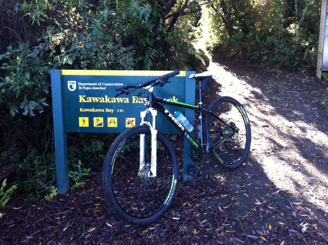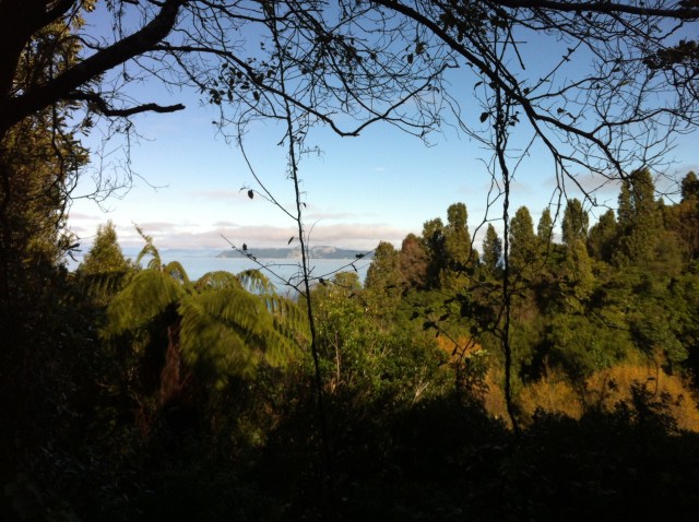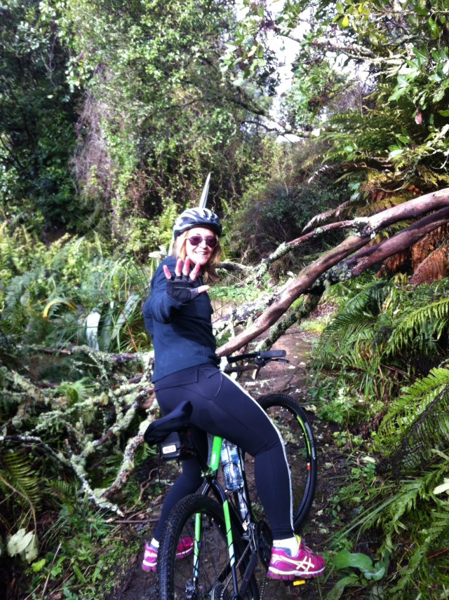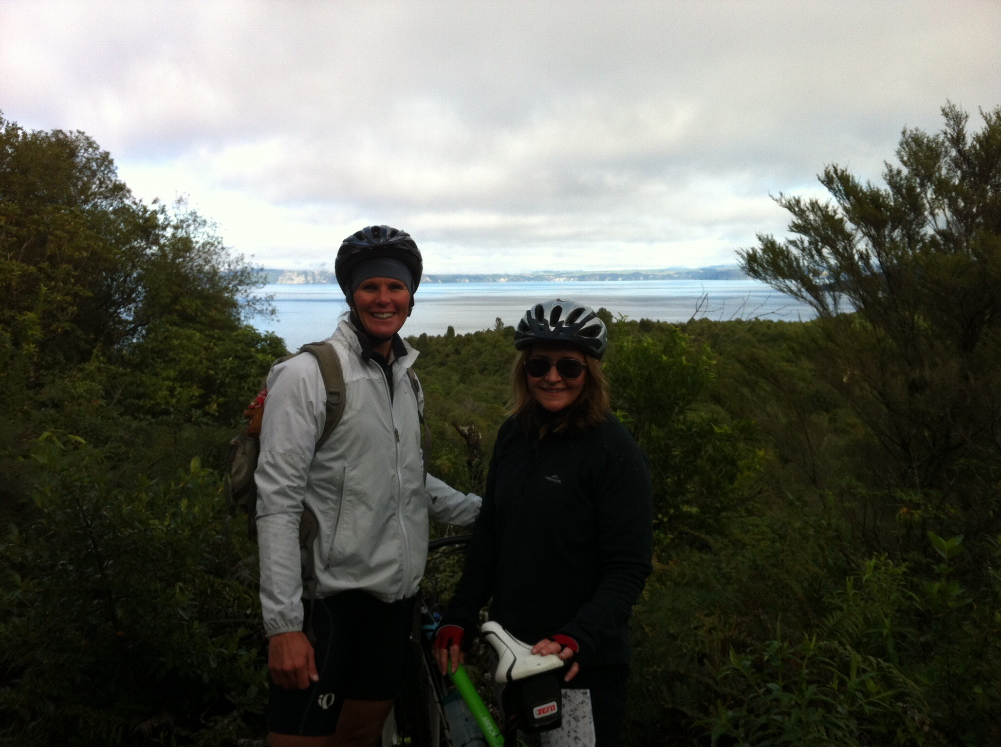 We were going to ride two parts (links) of the trail – Orakau to Kawakawa (9.8km) and Kawakawa to Kinloch or the K2K link (9.2km). There had been a bit of rain so the track was quite wet to start with and there were a few trees across the track which we had to manhandle. We also came across some very large hoof prints in the track which also made the riding fun. It wasn’t long before we discovered who the hoof prints belonged to – some large black beefies who took off at a rate of knots into the bush when we came along. Just prior to that Sheree had managed a spectacular dismount – luckily there was no harm done 🙂 The trail follows the Orakau Stream and Harakeke (flax) wetland and regenerating native bush down to Kawakawa Bay on the edge of Lake Taupo. This part of the trail is generally downhill and offers stunning views across the lake to the volcanoes of Tongariro National Park.