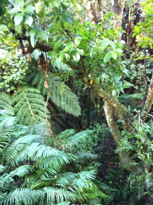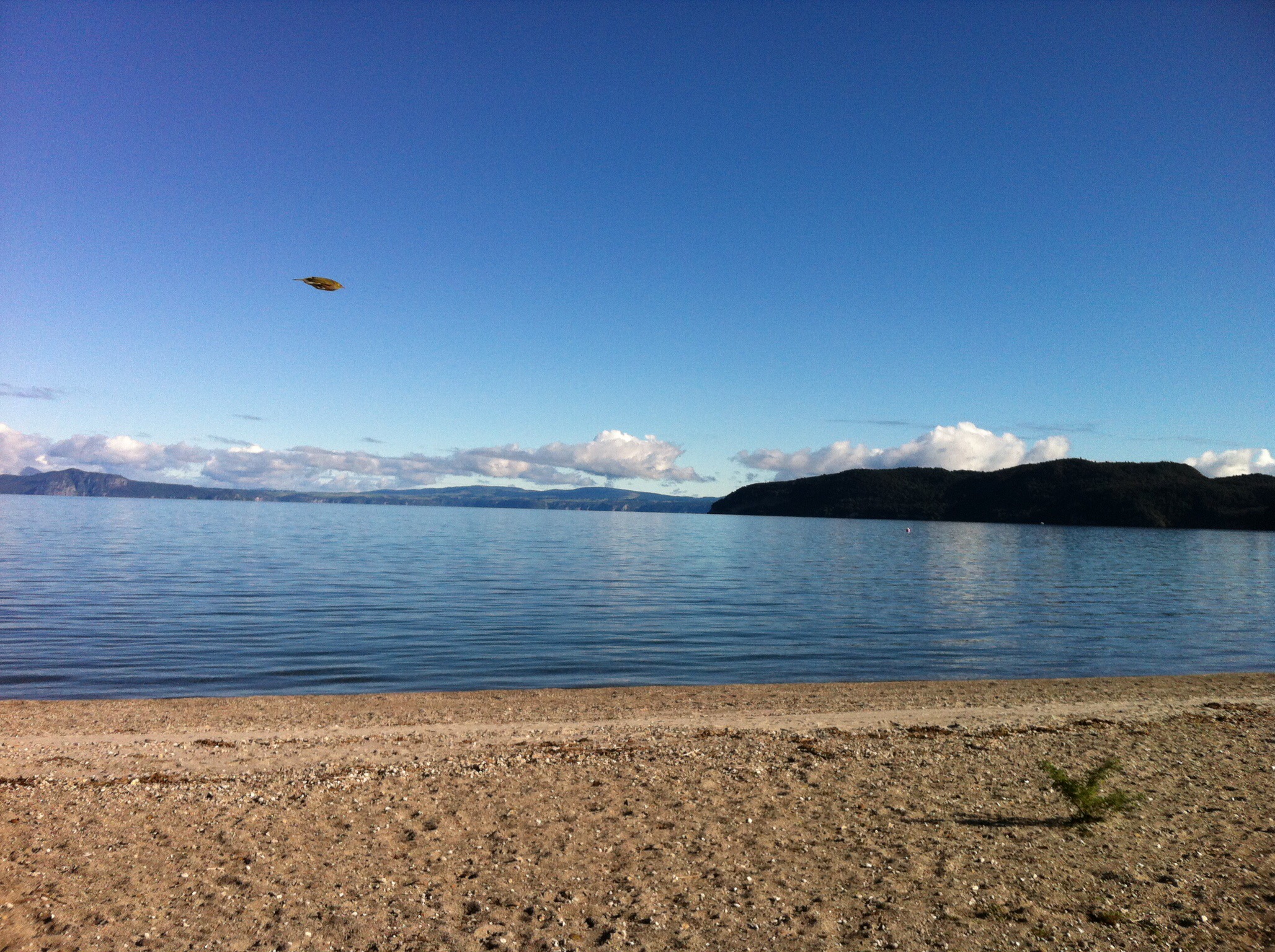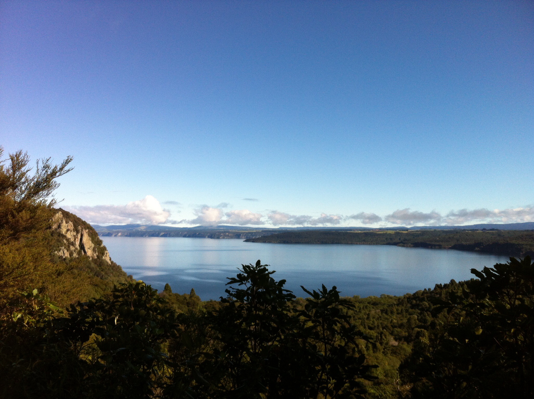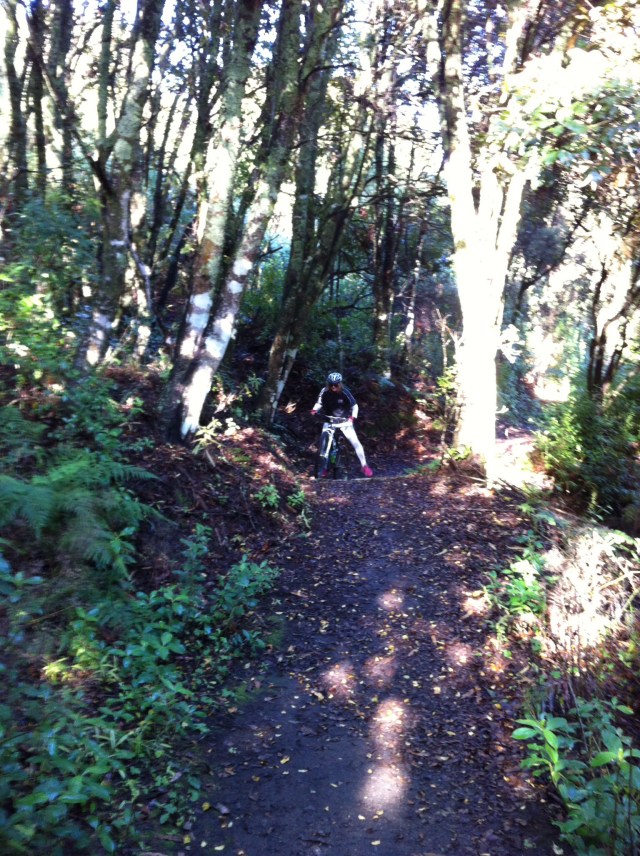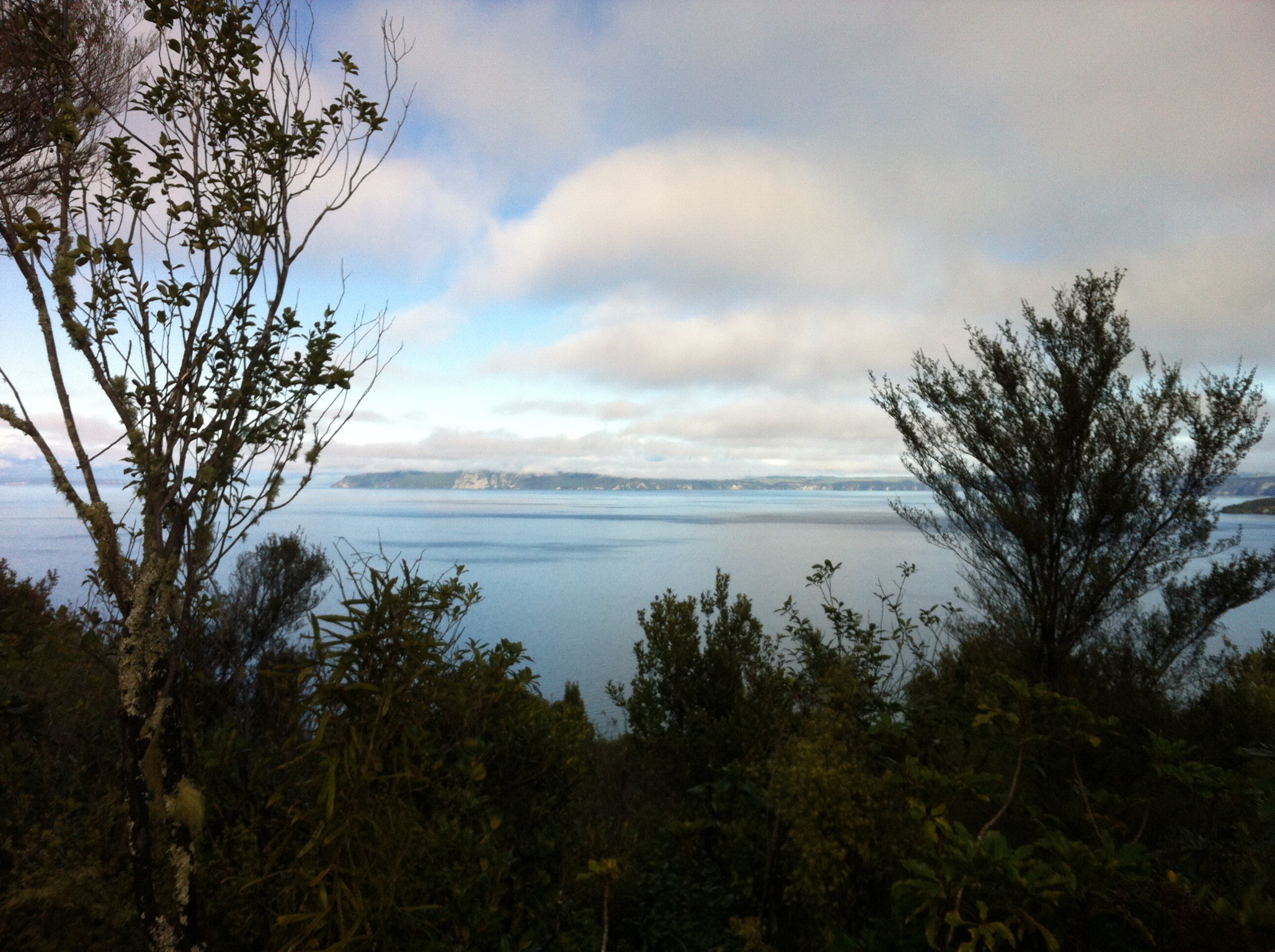 We were going to ride two parts (links) of the trail – Orakau to Kawakawa (9.8km) and Kawakawa to Kinloch or the K2K link (9.2km). There had been a bit of rain so the track was quite wet to start with and there were a few trees across the track which we had to manhandle. We also came across some very large hoof prints in the track which also made the riding fun. It wasn’t long before we discovered who the hoof prints belonged to – some large black beefies who took off at a rate of knots into the bush when we came along. Just prior to that Sheree had managed a spectacular dismount – luckily there was no harm done 🙂 The trail follows the Orakau Stream and Harakeke (flax) wetland and regenerating native bush down to Kawakawa Bay on the edge of Lake Taupo. This part of the trail is generally downhill and offers stunning views across the lake to the volcanoes of Tongariro National Park.