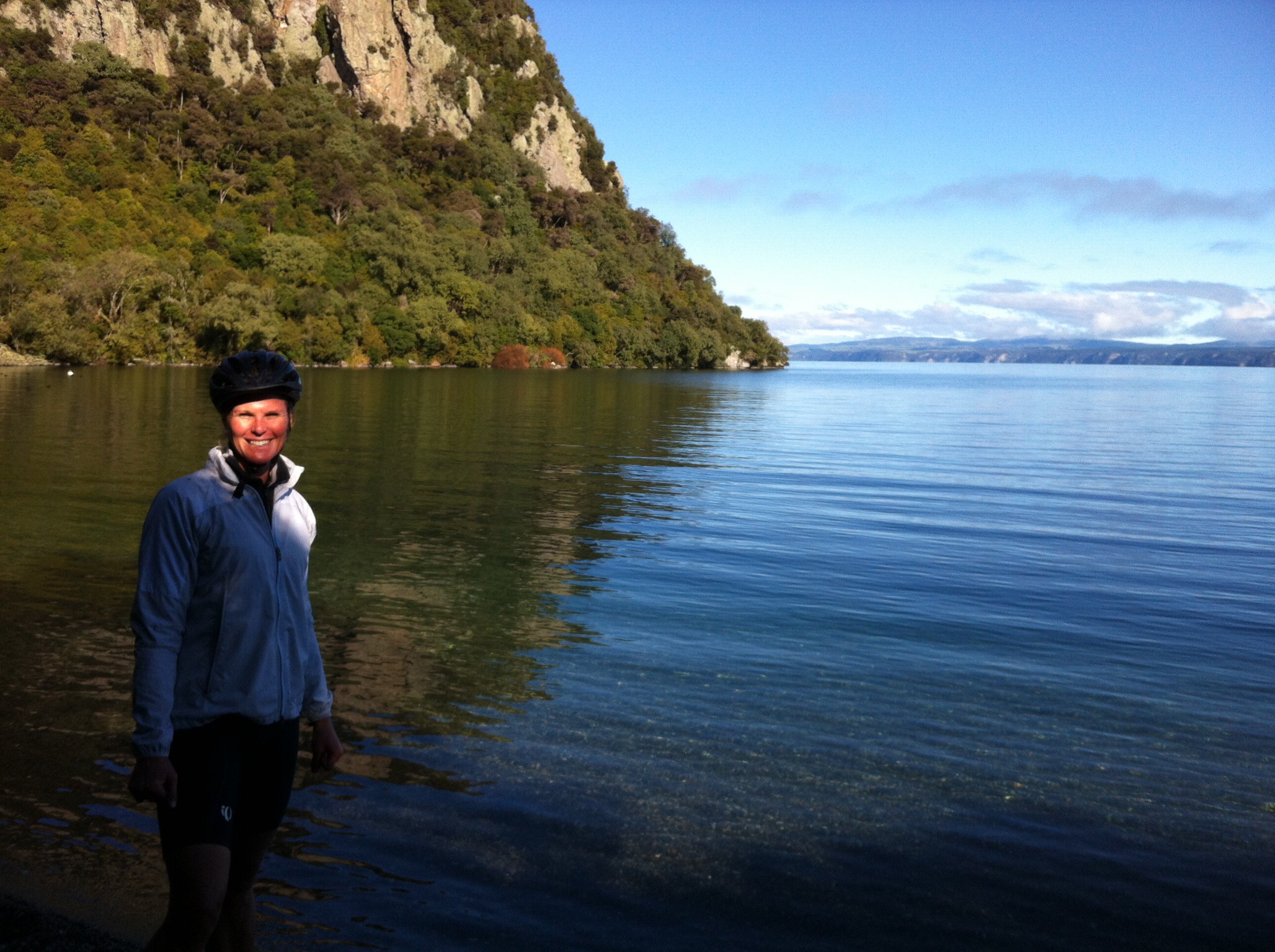 After admiring the crystal clear waters at Kawakawa Bay it was back on the bikes for a climb through native bush to the Te Kauwae Headland. The views from the high point across the lake and up to the Western Bays were spectacular. We were so lucky to have a clear day so we could enjoy the views. The trail then descends towards Kinloch with the last part of this section along the lake edge. We encountered some mountain bikers coming the other way as we got closer to Kinloch.