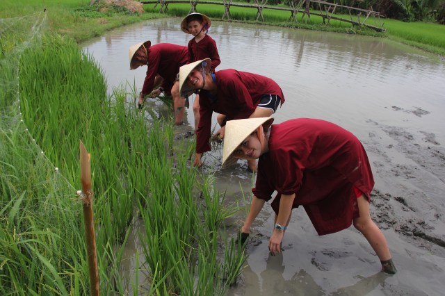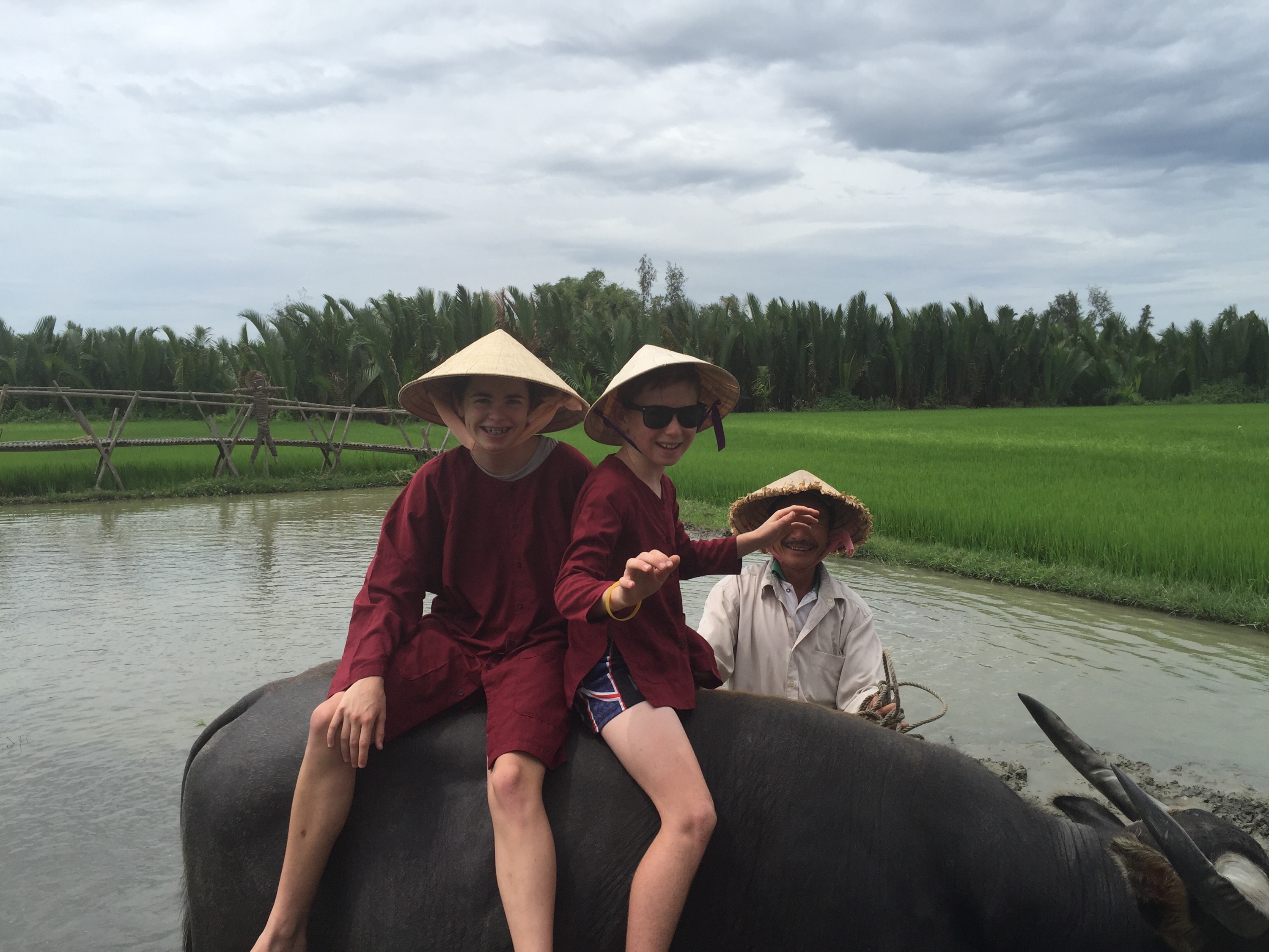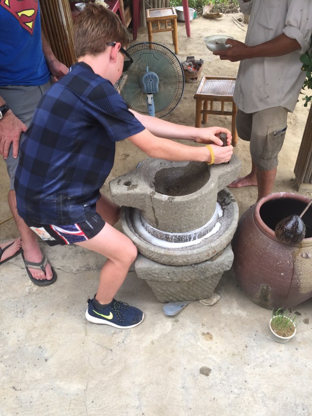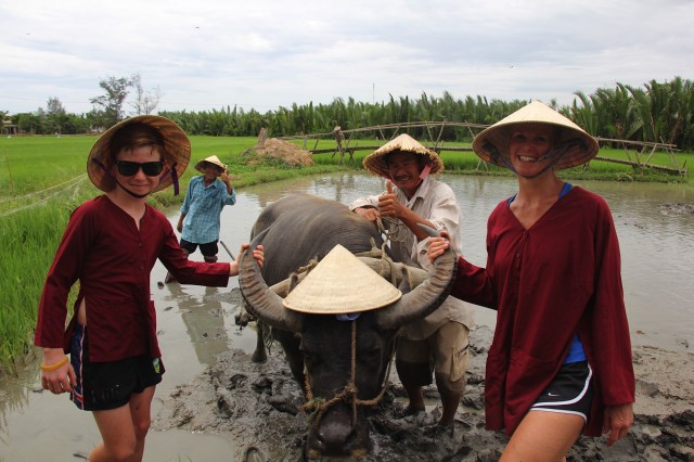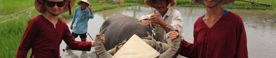 We had looked at a few tours and settled on Jack Tran’s Wet Rice Farmer Tour – Janine, Rod, Zoe and Hunter treated me for my birthday. Last year swimming in Lake Lucerne and enjoying fantastic Swiss hospitality, this year learning about rice and riding a water buffalo with more good friends – how lucky am I!