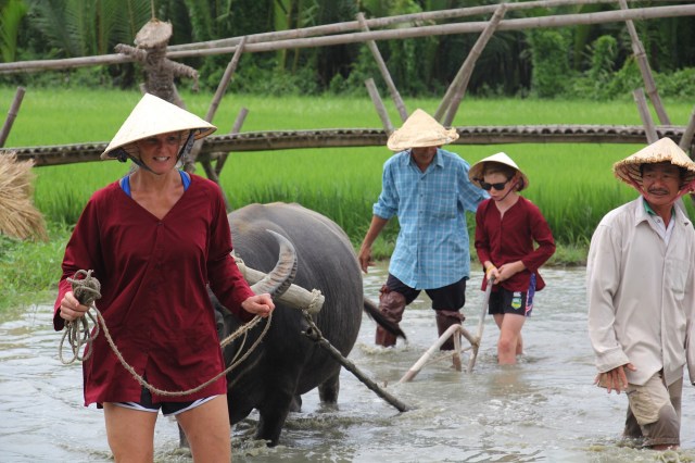 After much gooing and gaaing it was time to get to work. We donned our farmer clothes and traditional hats took some photos and choose who was going to ride Se (pronounced Say) the water buffalo first. Janine was first up followed by Zoe and Hunter in unison – they were figuring there was safety in numbers. Then it was my turn – it was a strange sensation and I was concerned that I would end up in the brown stuff! Rod took to riding the buffalo like a duck to water – he looked like he was going rodeo riding.