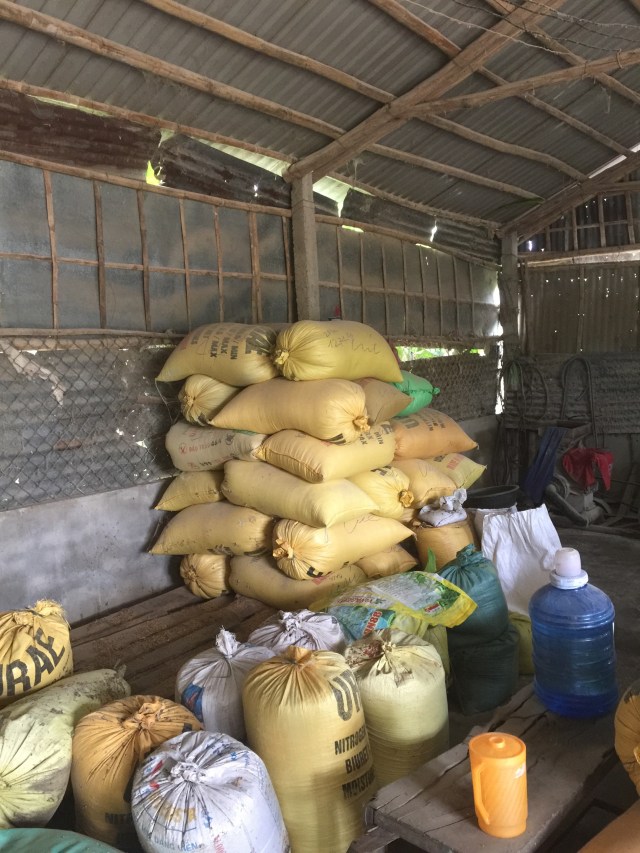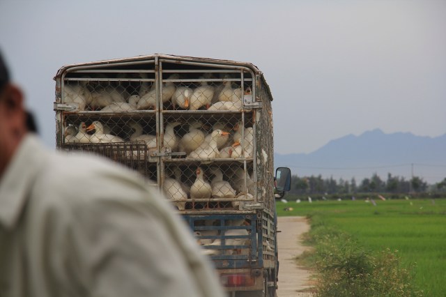 The first stop on our leisurely cycle was a duck farm. Eight million households (about 36% of all households) in Vietnam keep poultry – 65% of households keep chicken in small numbers (less than 200 heads per year), 25% of households keep ducks in small numbers (less than 200 heads per year) and 10 to 15% of chicken comes from commercial operations with a herd size of 200 to 500. 0.1% are integrated industrial farms with herd sizes of bewteen 2,000 and 30,000 chicken heads – these operations are normally integrated with foreign feed companies. Ducks are much cheaper to buy than chickens. A chicken in Vietnam is a high-value asset. Keep it laying eggs for you as long as possible. When guests come over or when you want a special meal, serve a whole chicken.