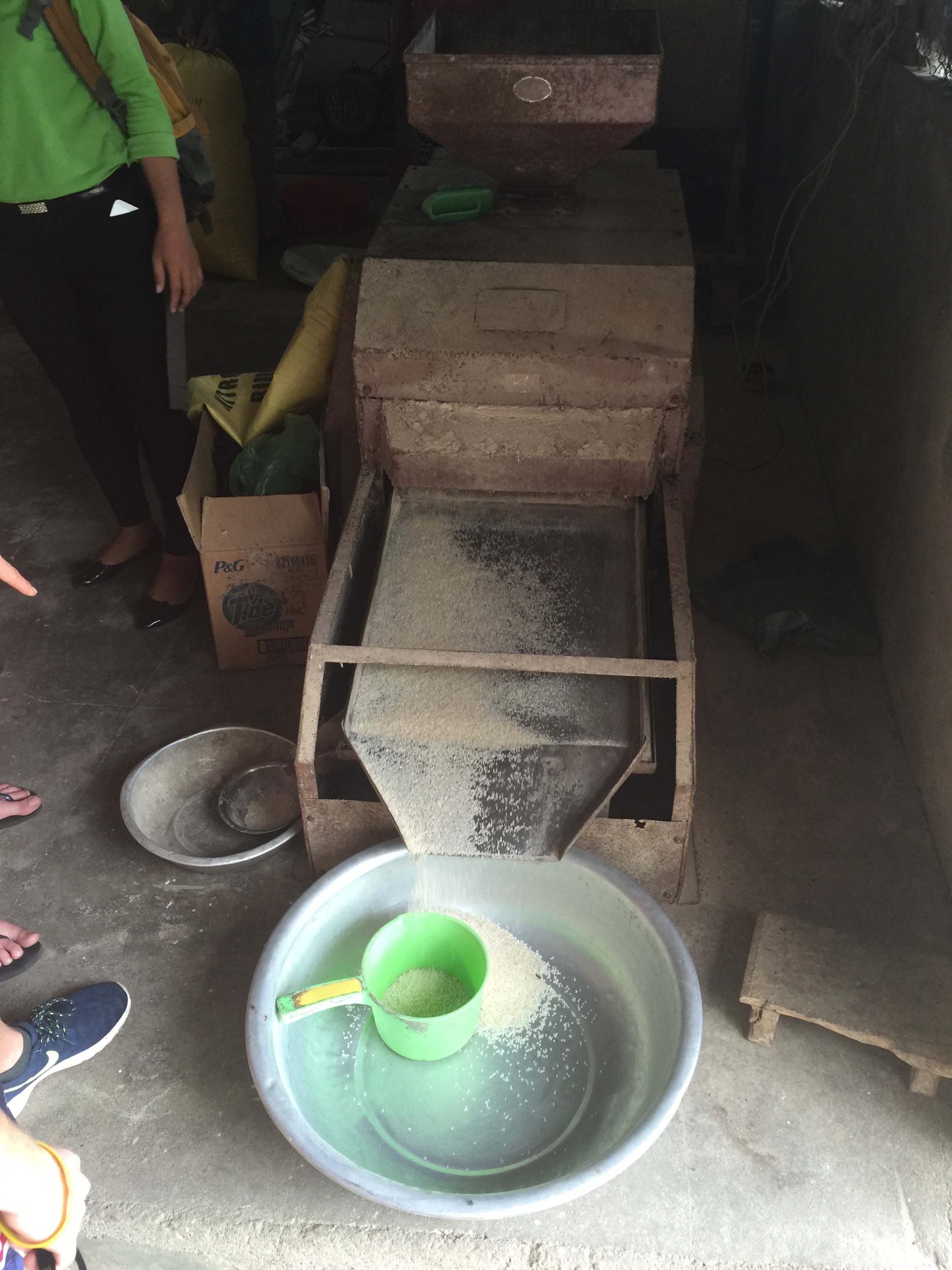 We were going to visit a wet rice farmer who was going to show us the traditional methods of wet rice farming from preparing the field to sowing the seed and then harvesting the rice. The traditional harvesting methods are not widely used anymore so we stopped off at a rice factory to see how machinery is now used. They had three machines – the first one separated the rice grain from the husk – this husk is then used for cooking fires. The next machine removed the finer husk remnants which are used in chicken food while the final machine cleaned the rice. The finished rice was then put into sacks and marked with the families name. The families pay the factory to carry out this process.