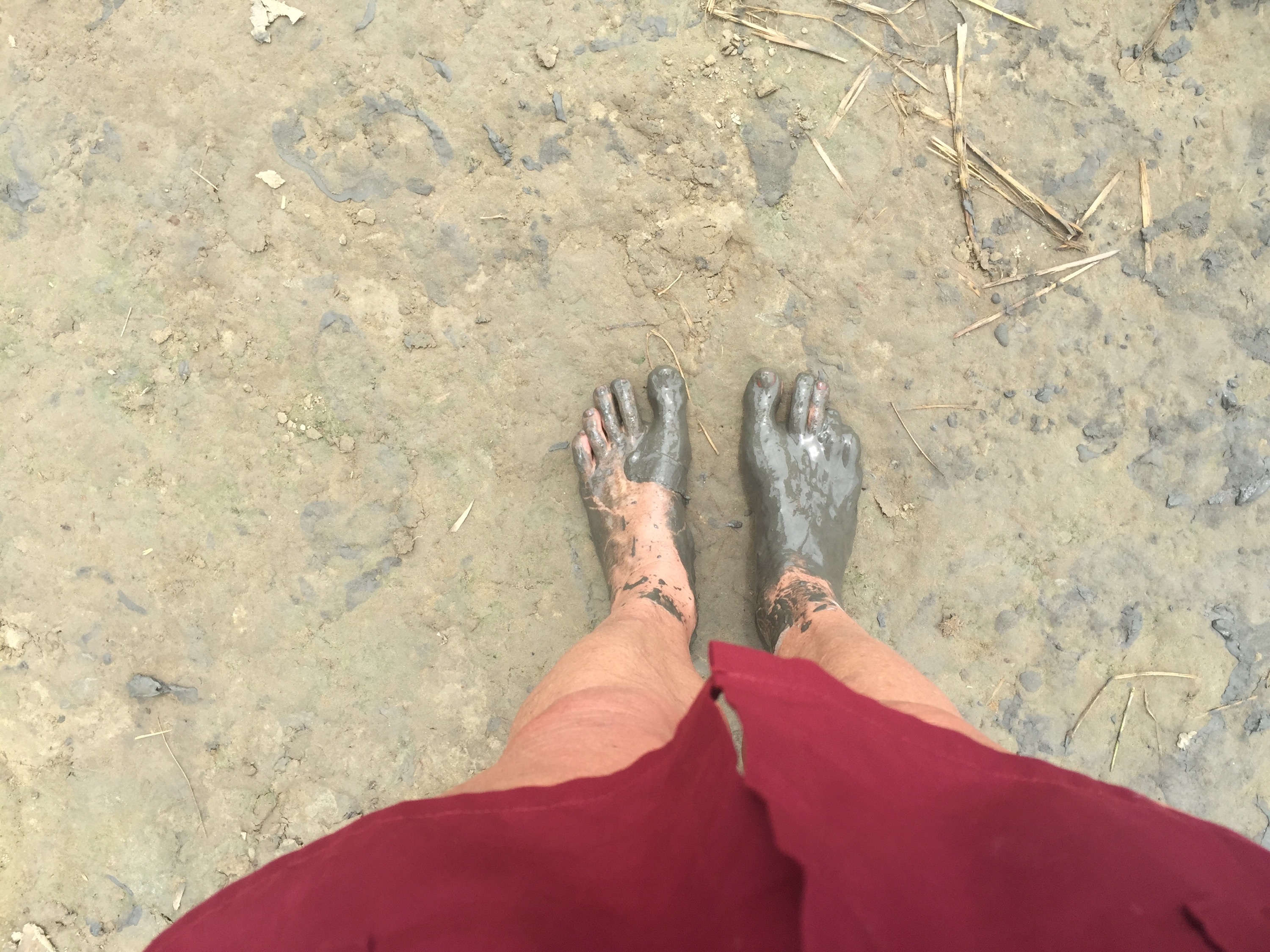 The rotary hoe was then hooked up and we had turns leading Se and guiding the hoe from behind. We all braved squishing and squelching through the mud. After a rice harvest the soil is very acidic so turning it over allows all the good stuff to come to the top. Ploughing a plot of 500 square metres would normally take two to three days. The field is then raked – we stood on top of the rake and held onto Se’s tail as he pulled us around – water skiing buffalo style. Standing on the rake provides weight and allows it to get traction. The next step is to remove the water from the field – there was a little plot set aside where we could practice the traditional method which consisted of two people on either side of a bamboo bucket with ropes attached. You use the top and bottom ropes to maneuverer the bucket. No need for the gym here – this is a good workout in itself.