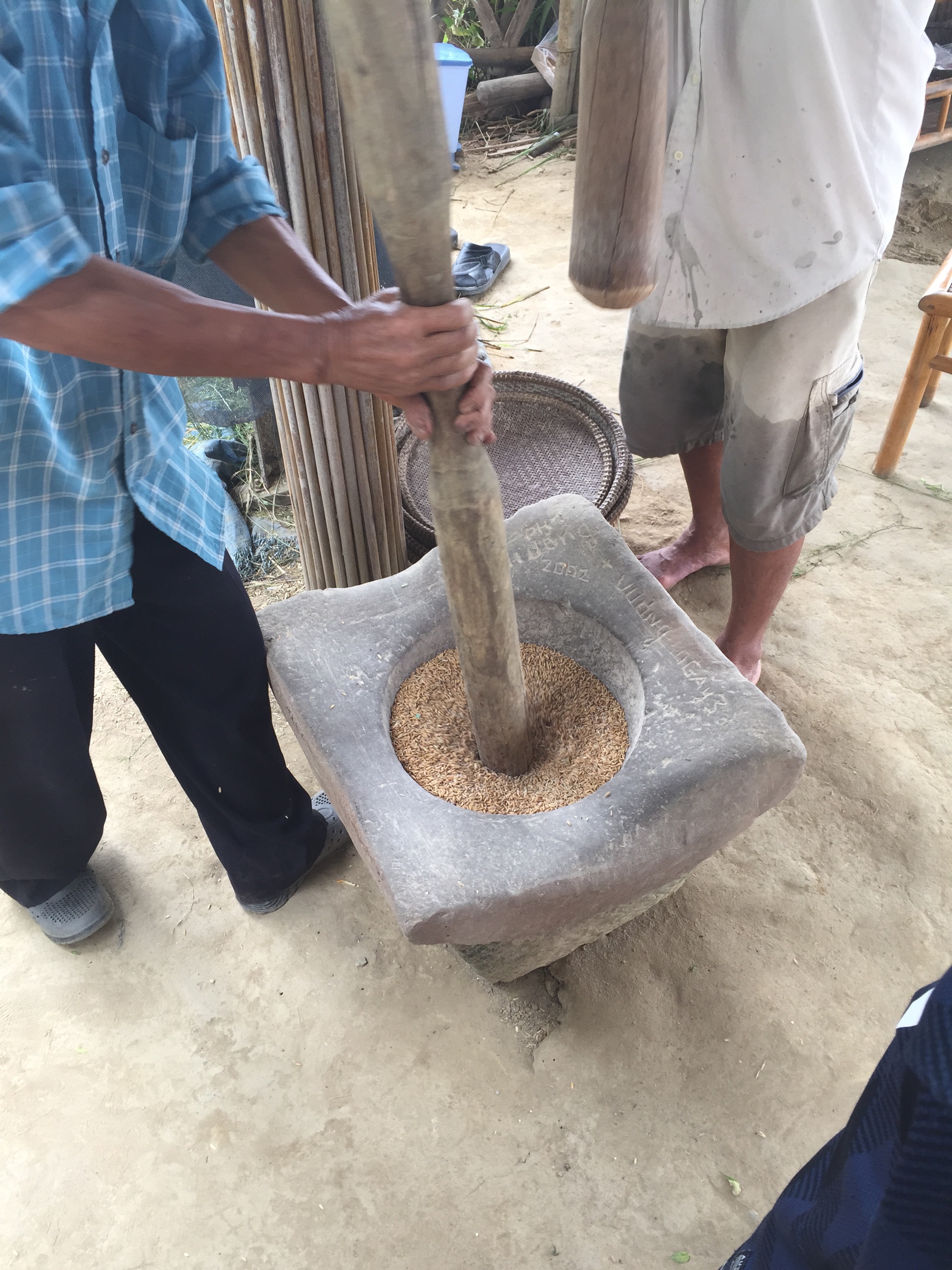 After harvesting, the rice must be dried before being pounded to separate the rice grain from the husk, or the rice bran. Traditionally rice was pounded by hand and retained more protein and fat which made it more nutritious. Now rice is more often milled at a rice mill but is less nutritious.