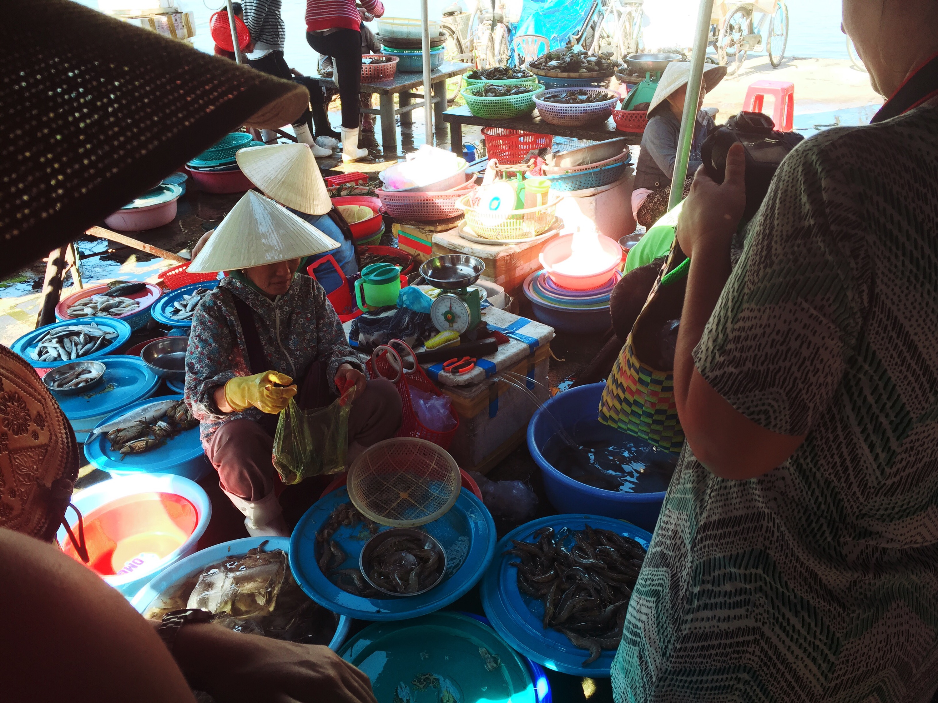 On Thursday Laura and I went into Hoi An to join a group going out to Thuan Tinh Island’s Cooking School. There were six of us in our group and our Chef and Tour Leader Hon handed us all a shopping basket as we arrived. It was then a short walk to the market where Hon explained various foods to us and purchased the ingredients we would need for the cooking class. No matter how many times I have been in the market all the weird and wonderful produce still amazes me. The meat section is especially interesting given they don’t have refrigeration as such – that is why it is imperative they sell all their product as quickly as possible. All the stalls are attended by woman wielding large knives – some I wouldn’t want to get on the wrong side of!