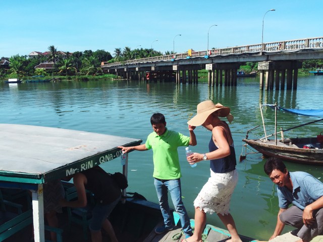 All our purchases were then off loaded to be transported to the island by motorbike – a much quicker way to get there as we discovered on our trip back to Hoi An after the cooking class. We walked down to the river to board our boat for the 45 minute ride to Thuan Tinh Island. All the fishing is done at night so there were a number of fishing boats parked up. The big fishing nets were also out of the water.