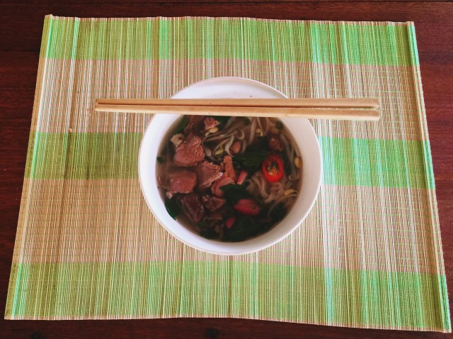 The last dish of the day was the Pho Bo Hanoi – Beef rice noodle soup infused with beef bones, cinnamon, ginger and star anise. Pho or soup is a staple dish of the Vietnamese people. Prior to doing the spring rolls we had prepared the beef stock which needed to boil for about an hour and a half. Hon showed us how to ‘cook’ the noodles by putting them in a strainer and holding them in a pot of boiling water for about ten seconds. We also cooked some thinly sliced beef in the same way. We then assembled our Pho and ate it – we were pretty full by this stage so didn’t do the dish justice. I have had this dish once before and although I am a cinnamon fan it isn’t a favourite of mine.