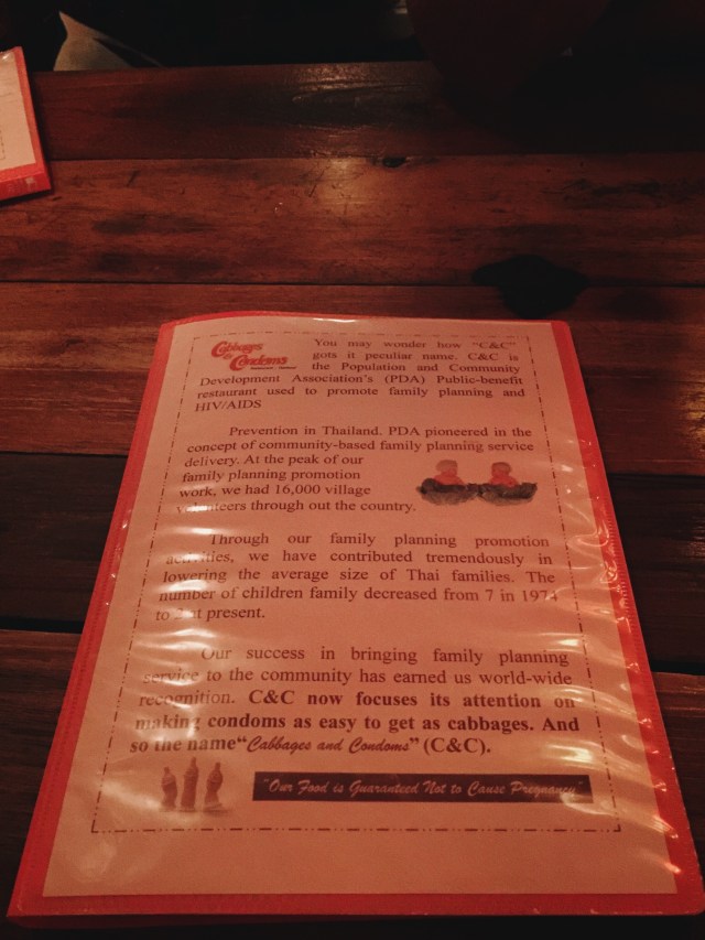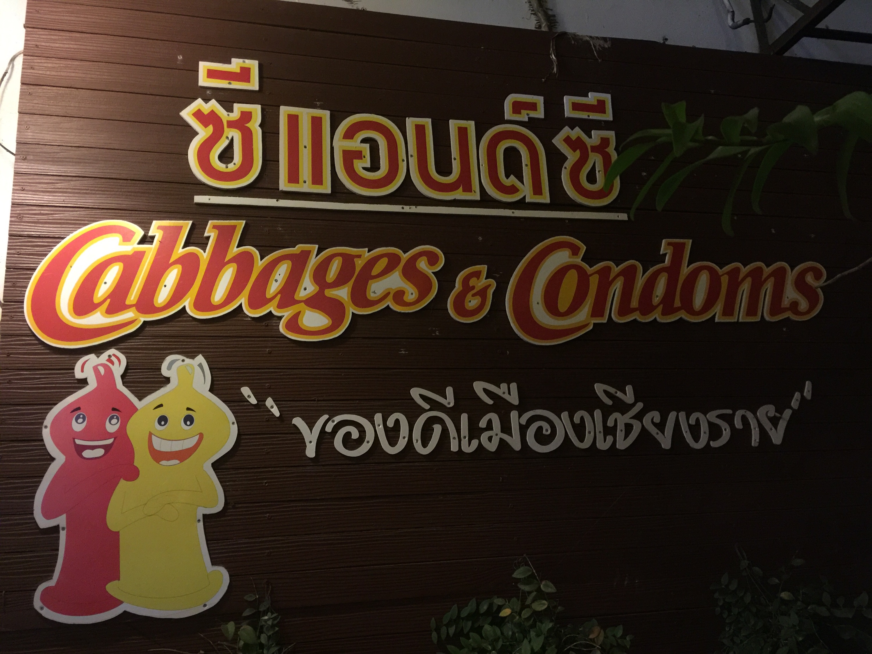 Established in part to support the activities of Population and Community Development (PDA), the Cabbages & Condoms (C&C) Restaurants offer a pleasant dining experience in several locations around Thailand. Not only do the restaurants offer excellent food, but they also promote the health and safety aspects of condom use in a fun and amusing manner. All proceeds from the restaurants are used to fund the social development programs of PDA. Their focus is on making condoms as easy to get as cabbages and with the average number of children per family falling from seven in 1971 to two now it is obviously working : )