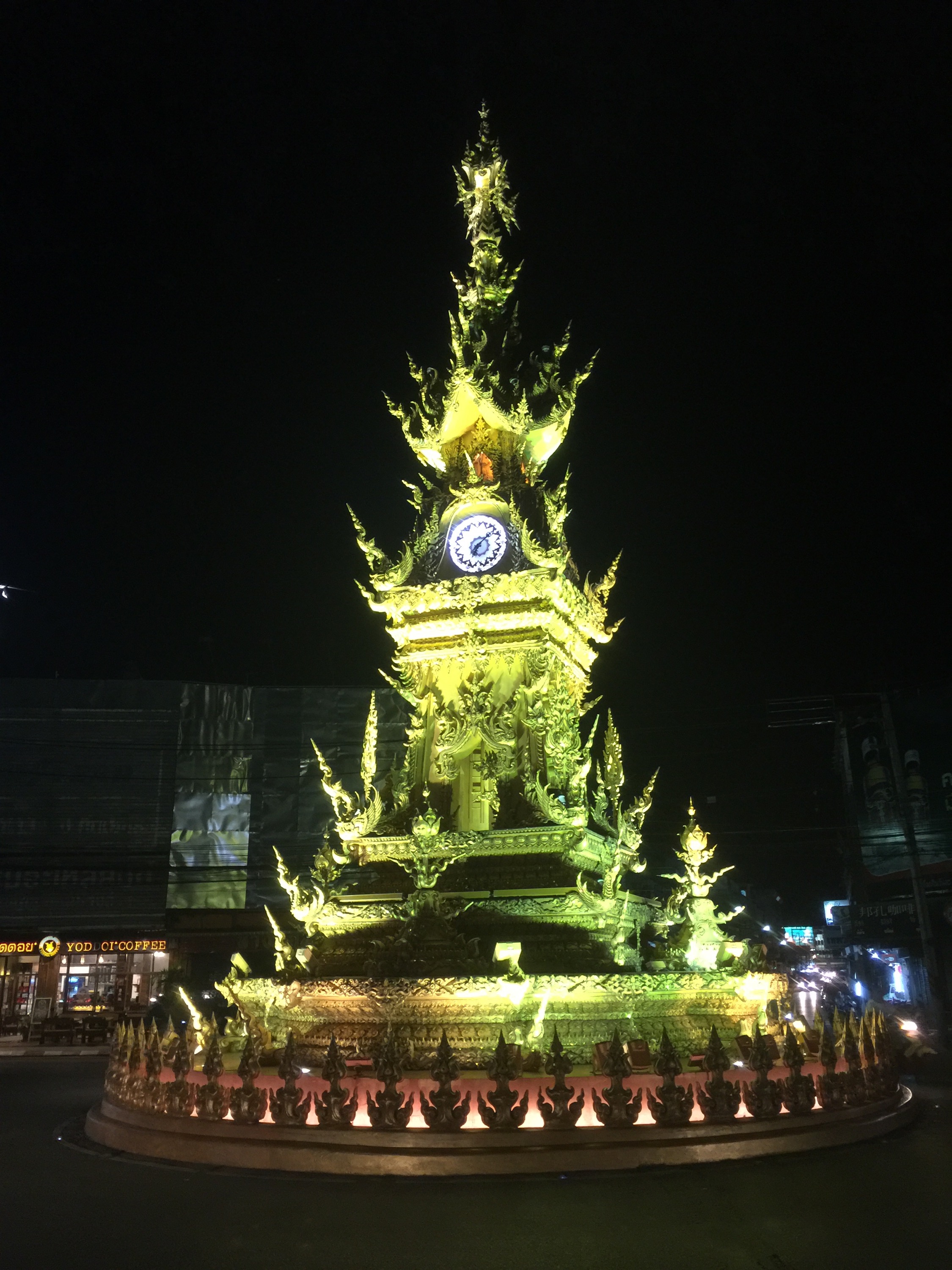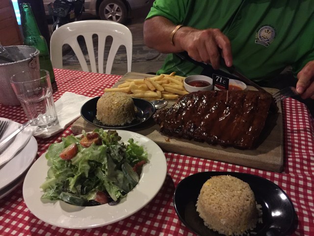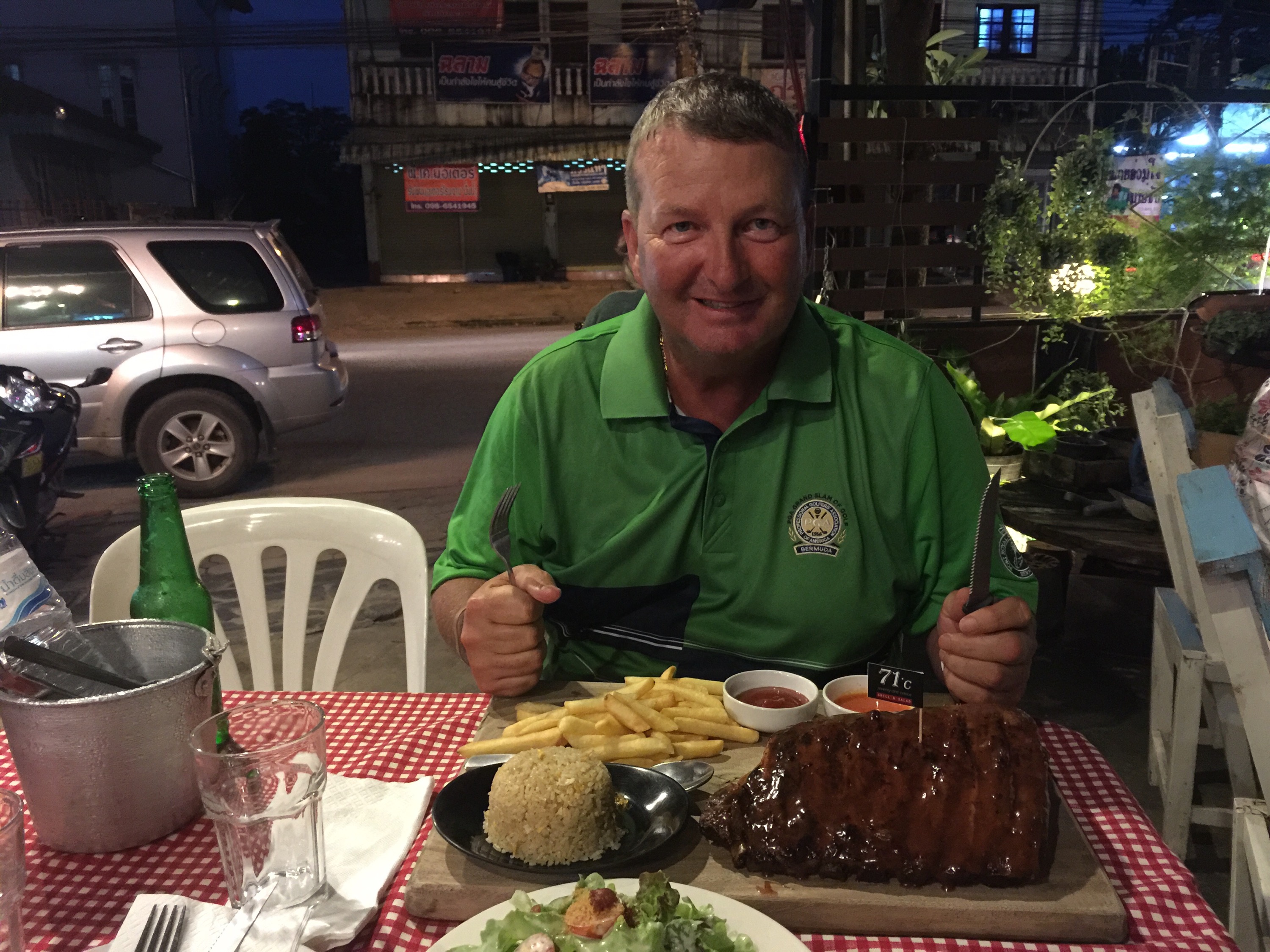 It turned out to be a local semi open air restaurant with a limited menu – pork ribs, fish, nuggets with a selection of three sides – egg fried rice, salad and fries. It was a hive of activity with many locals enjoying dinner there. Steve ordered the large portion of ribs with two sides – NZD14! I just had the salad and rice as I am not a fan of ribs. Steve was in heaven – the ribs were fantastic. My rice and salad were also lovely. They may only have a small offering but what they do they do well. The kitchen staff worked like clock work with one cooking the ribs on the BBQ, one in charge of the deep fryer and they other preparing salads. The wait staff were also happy, friendly and efficient. It was so good we went back on our last night in Chiang Rai too. A winning formula!