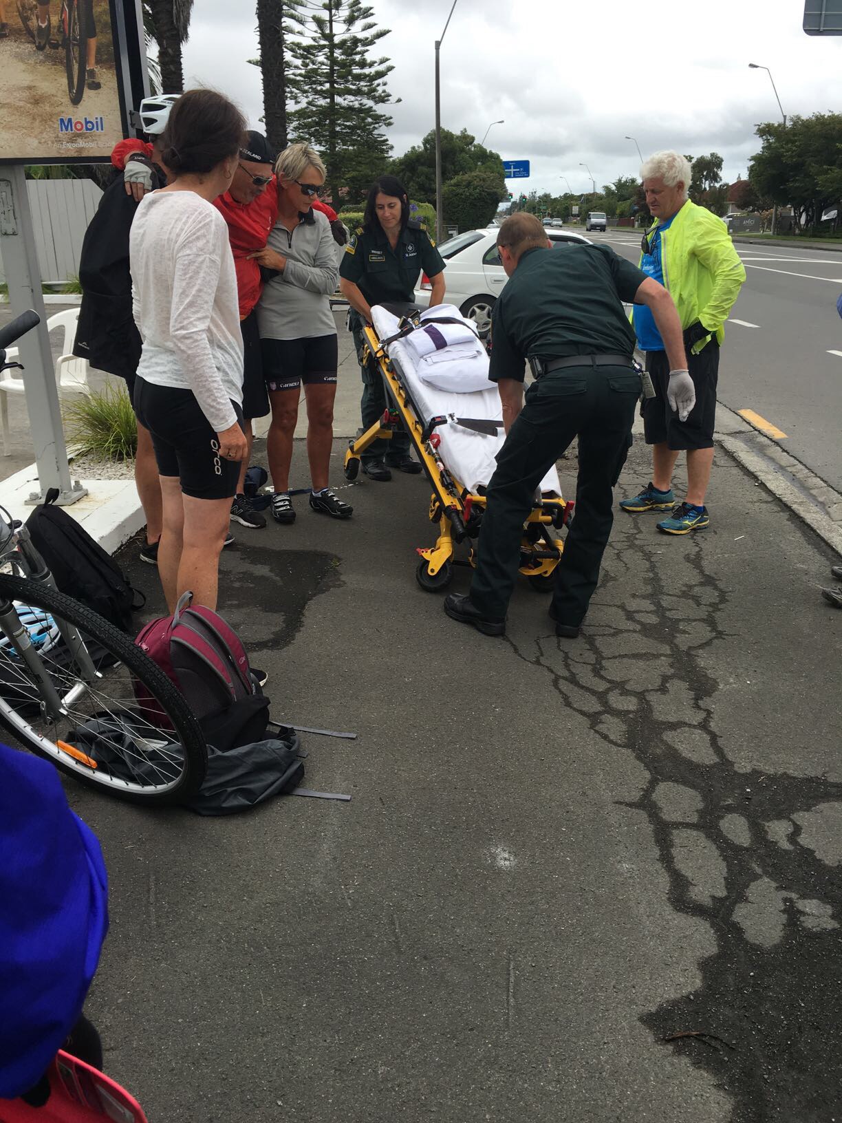 By the time I got back to Hastings in the car with my bike on the back, Kevin was being loaded into the ambulance. The irony of all this is that the Hawke’s Bay Hospital was 300 metres around the corner from the scene of the accident. From the time of Karen’s phone call to me arriving back in the car was about 50 minutes. It must have been a busy morning in the Hawke’s Bay for emergencies. The other irony was that I had written in the trip notes “You will pass the Hastings Hospital on your left – this services the whole Hawkes Bay – hopefully we won’t need to pay a visit!”