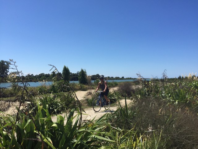 It is approximately 6km from Havelock North to the start of the trail. We then spent 8km riding along a limestone stop bank with apple trees and vines to our left and the Tukituki River to our right – unfortunately you cannot see the River due to the trees. At the end of the 8km you turn right to cross Black Bridge before crossing the road to head towards the ocean where we stopped to watch some fisherman reeling in Kawhai.