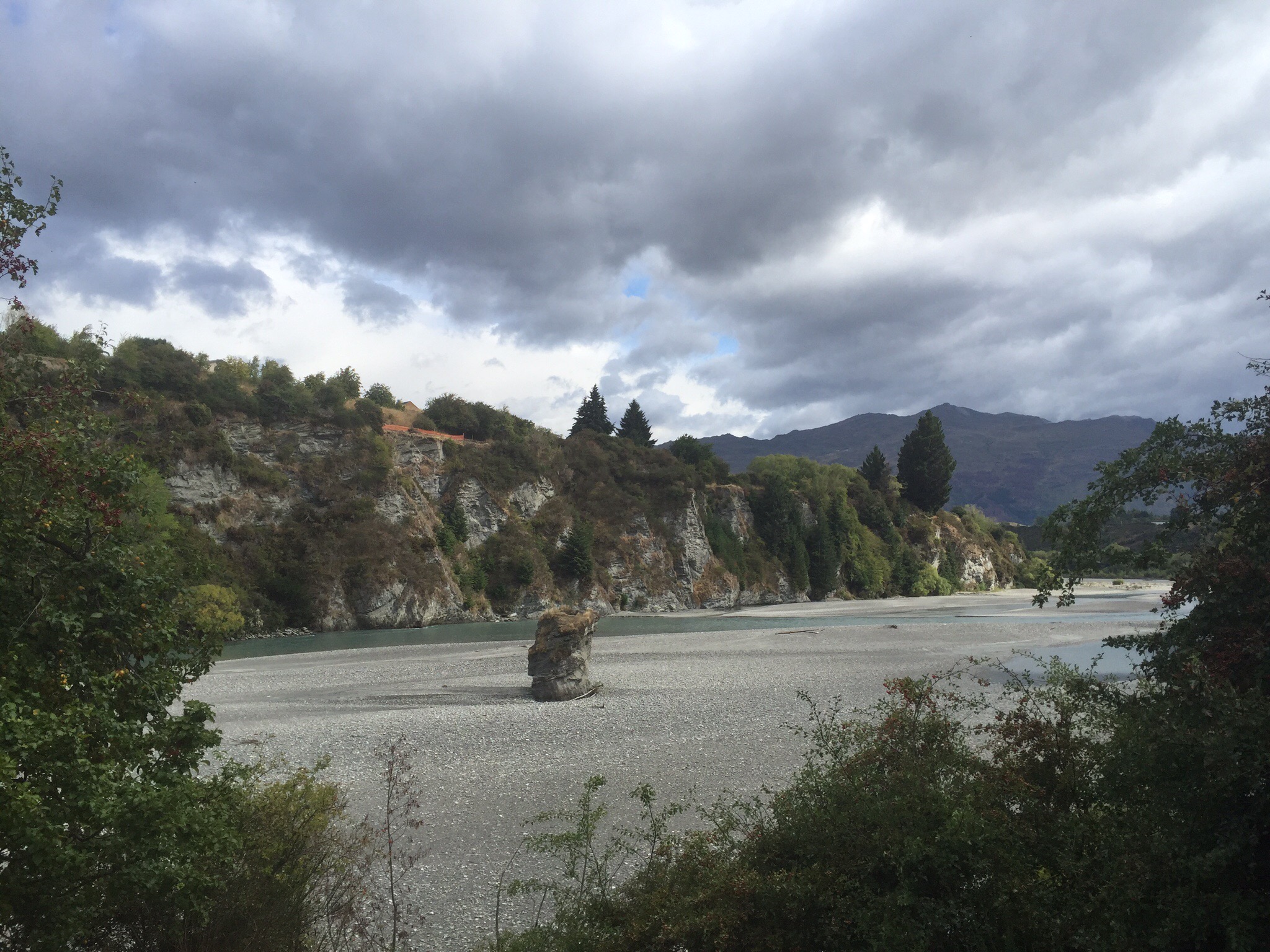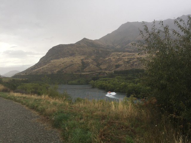 Today’s itinerary included riding from Queenstown Airport to Arrowtown and then from Arrowtown to Chard Farm Winery.  Unfortunately it was a bit of a gloomy day and we had a few spits of rain along the way.  We started the cycle along the Kawarau River where we saw a jet boat taking some tourists for a spin.  We the past the Queenstown sewerage treatment plant (affectionately known as the ‘pooh ponds’ by the locals) before reaching the historic Old Lower Shotover Bridge.