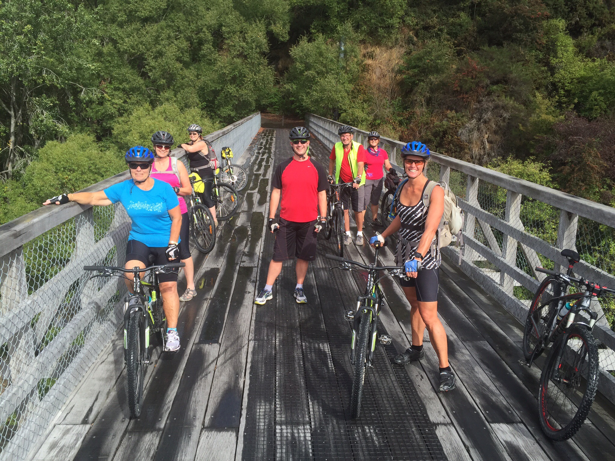 After lunch it was back on the bikes to ride along the Arrow River Bridges ride all the way out to the Kawarau Bridge which is used to bungy jump off.  This ride was fabulous – it gently undulated through the bush before continuing alongside the Kawarau River.  We got to the Kawarau Bridge where we saw some people jumping off.  Some of us jumped in the van to get a ride up the rather long driveway into Chard Farm winery while others rode it.  It was actually easier than it looked : )  In days gone by this driveway formed part of the old main coach link between Queenstown and Cromwell.