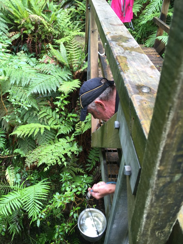 The first part of the walk is through some bush and down a number of steps to the coast – note these are the same steps we will be coming back up on day three. The track is a loop and you actually re trace your steps for the first ten kilometres on day three. Everyone was in high spirits so the cool, cloudy weather didn’t put too much of a dampner on things. At Flat Creek you start going inland and it is very sheltered in the bush. The track was gradually ascending but you didn’t really notice it. We stopped at Water Bridge for lunch and to refill our water supplies from the stream using a string and pot system.