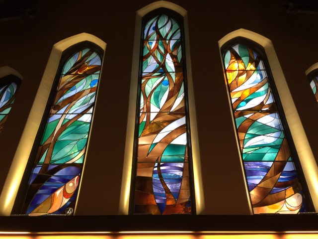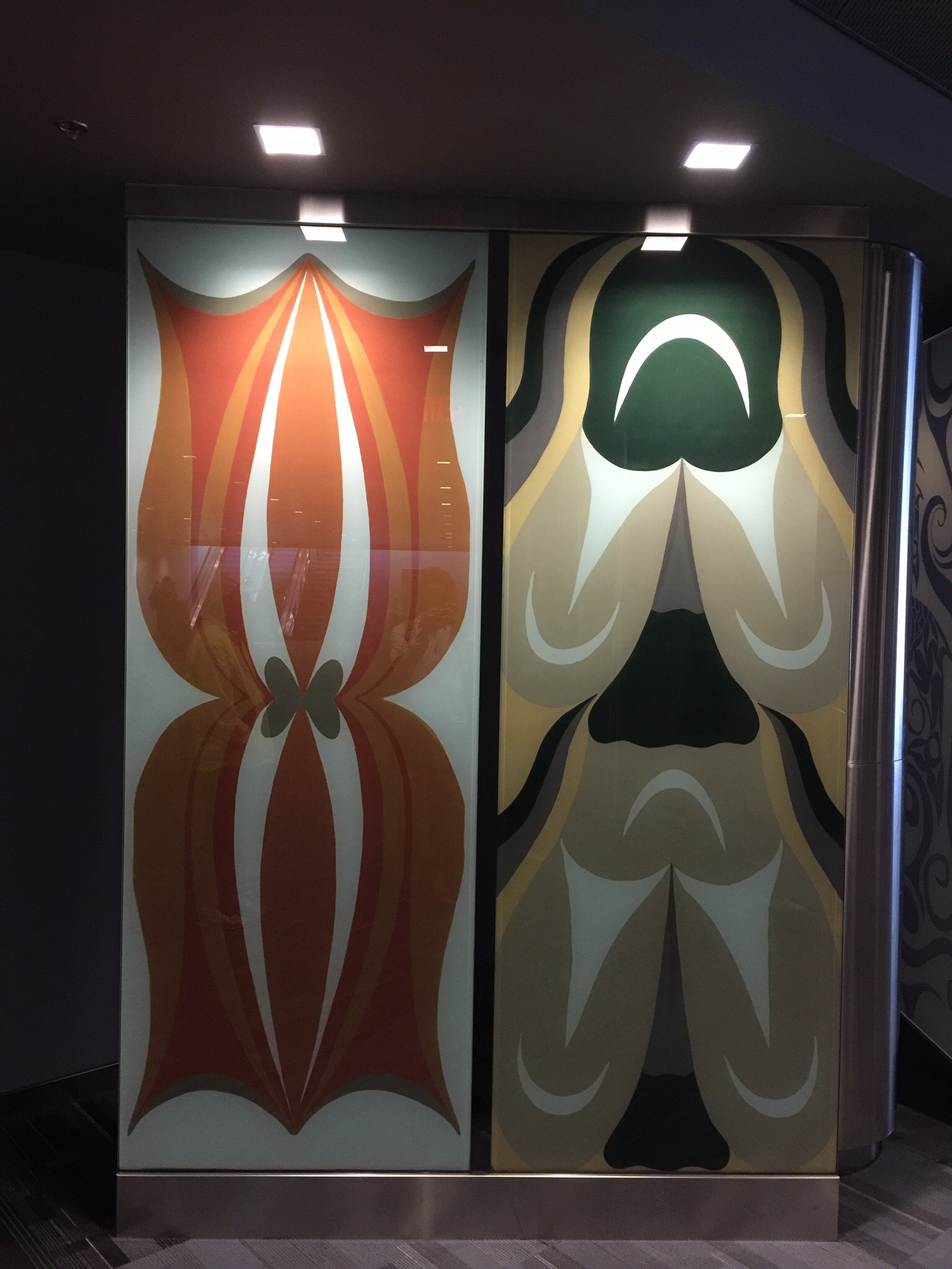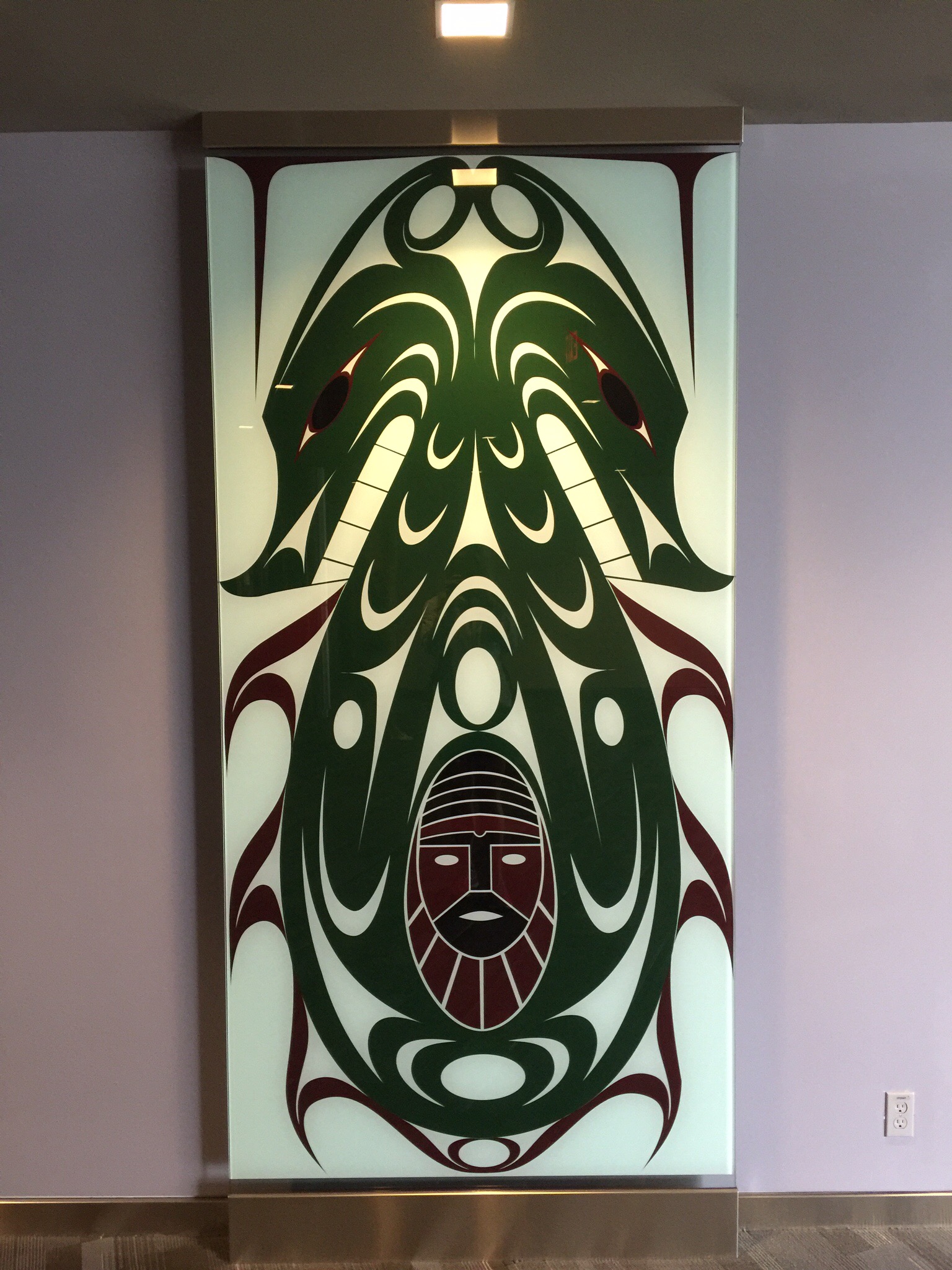 The dog’s face is in the right hand corner of the left hand panel – these windows were designed by Susan Point