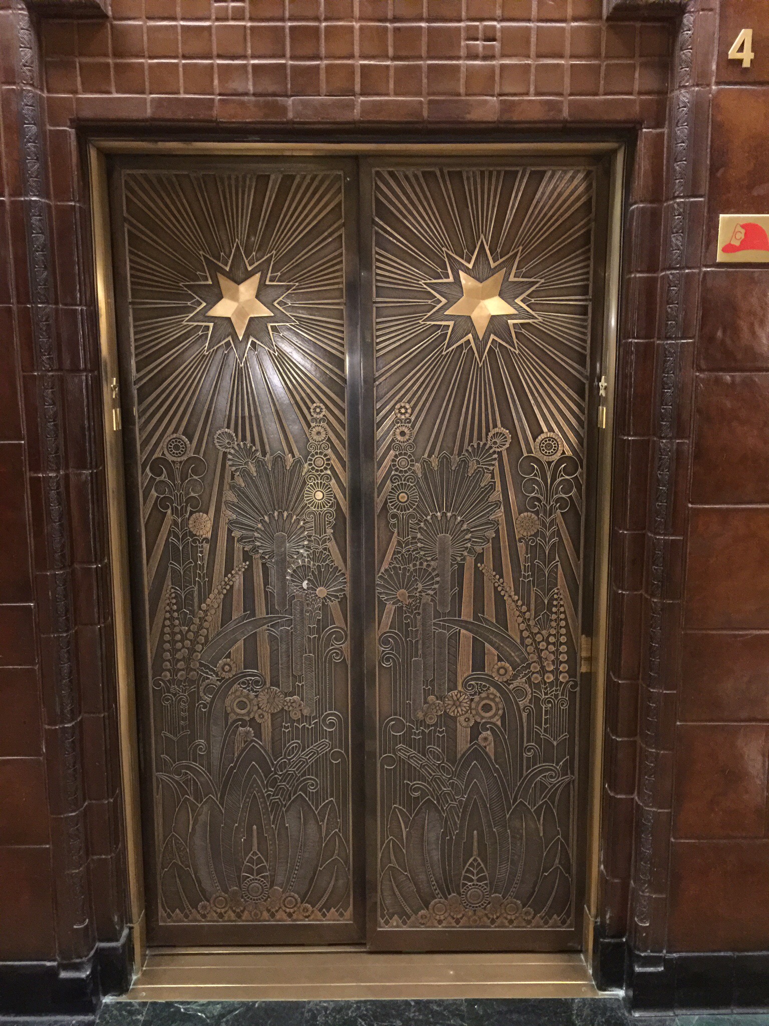 There was an observation deck, but during the depression in the 1930s the 25-cent admission price proved unaffordable for most. Currently, there are no public galleries in the building.Inside the massive brass-doored elevators the walls are inlaid with 12 varieties of local hardwoods. All over the walls and polished brass doors are depictions of sea snails, skate, crabs, turtles, carp, scallops, seaweed and sea horses, as well as the transportation means of the era. The floor presents the zodiac signs. The exterior is studded with flora and fauna, tinted in sea-green and touched with gold.