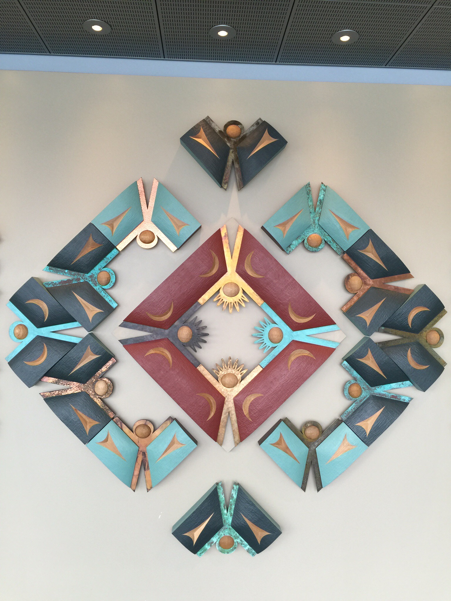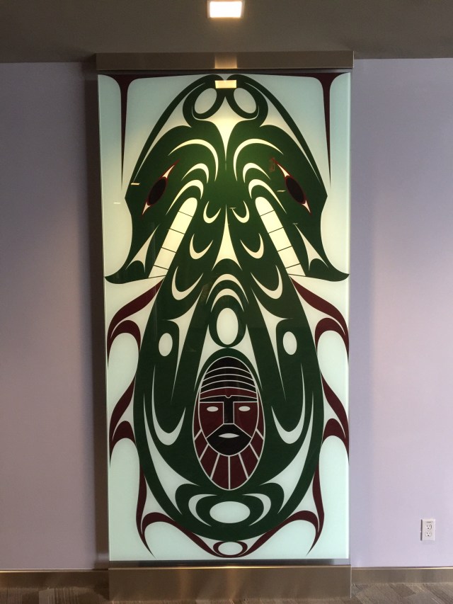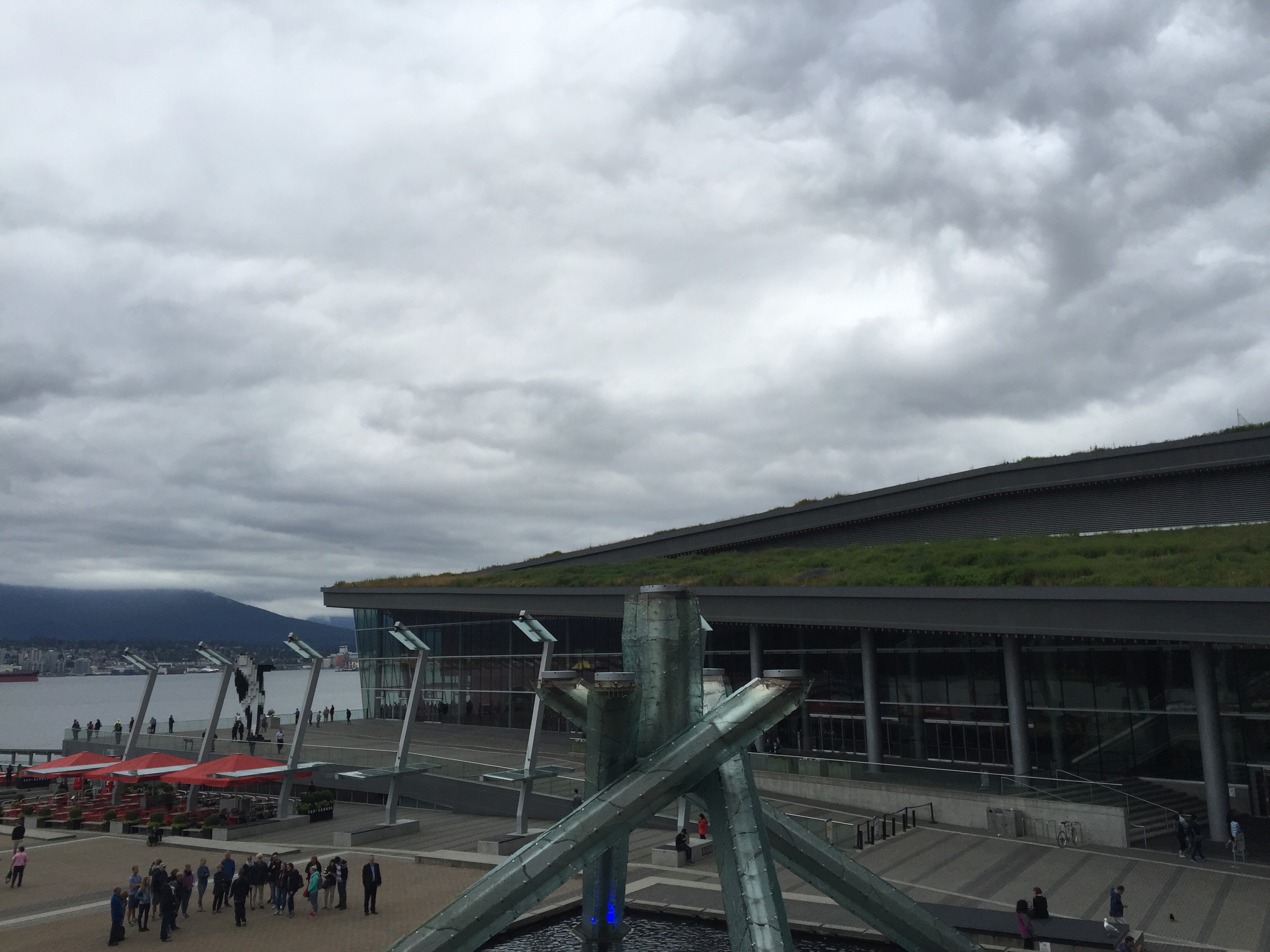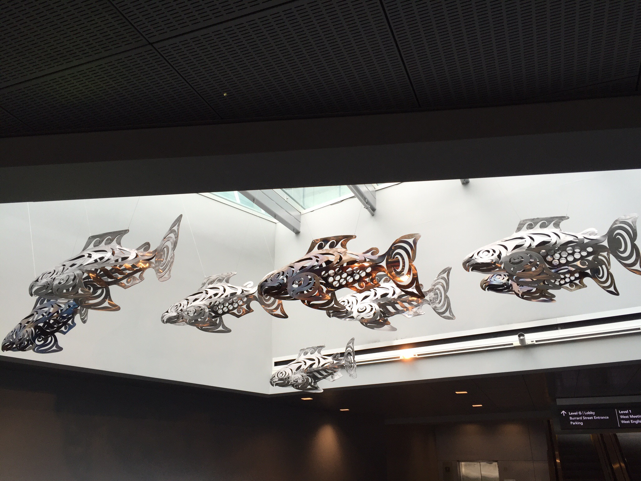 We saw various artwork in the Convention Centre including the Totem Pole.  Totem poles are monumental sculptures carved on poles, posts, or pillars with symbols or figures made from large trees, mostly western red cedar, by indigenous peoples of the Pacific Northwest coast of North America (northwestern United States and Canada’s western province, British Columbia).  The carvings may symbolize or commemorate cultural beliefs that recount familiar legends, clan lineages, or notable events. The poles may also serve as functional architectural features, welcome signs for village visitors, mortuary vessels for the remains of deceased ancestors, or as a means to publicly ridicule someone. Given the complexity and symbolic meanings of totem pole carvings, their placement and importance lies in the observer’s knowledge and connection to the meanings of the figures. We also saw some more Susan Point artwork. Susan Point is considered one of Canada’s most famous artists. She was born in Alert Bay, BC in 1952 and has lived on the Musqueam First Nation reservation in Vancouver since birth. She began her art career in 1981, choosing to concentrate on the traditional designs of her own people, and was particularly intrigued with the Spindle Whorl, an elaborately carved wooden disk used for spinning wool which inspires many of her works. A prolific artist, her large scale works grace public buildings on both sides of the Canadian and USA borders, paying tribute to the First People’s of these countries. She has received a National Aboriginal Award for her work as an artist and was recently awarded the Order of Canada.  We also saw a display of metal salmon. The salmon is a very important food source in this part of the world. Erik explained how salmon are born in fresh water and make there way down stream to the sea where they live their lives. When it is time for them to breed and subsequently die they swim upstream back to the place they were born. They then lay their eggs and die. Swimming upstream makes them a very strong fish with many health benefits for those that consume them. They have high levels of nitrogen so when the beers eat them and then defecate in the forest they return this nitrogen to the land which helps the trees prosper. It is a great story of the circle of life. The living roof on top of the convention centre