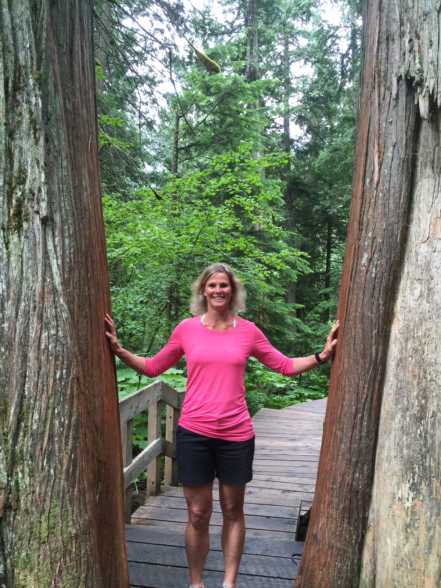 About 25km out of Revelstoke is the Giant Cedars Walk which Diane had recommended we do – it was only half a kilometre long but had a high concentration of giant Cedar Trees, some of which were more than 500 years old. Unfortunately the weather wasn’t the best but the rain had eased when we got to the GIant Cedars Walk. This forest is here as a result of moist westerly air flows from the Pacfic Ocean rising over the Columbia Mountains. As this moist air climbs, it cools and produces incredible amounts of rain and snow. The combination of substantial Spring snowmelt followed by abundant rainfall during the growing season makes this area the perfect lush forest environment. These conditions are unique to British Columbia. This is the only place in the world where a temperate rainforest exists this far from an ocean coastline.