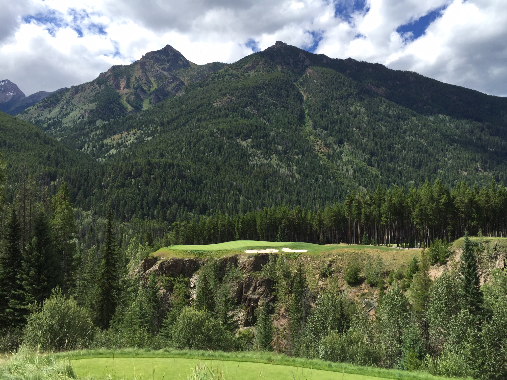 Popcorn in hand, we took a drive up to Panorama Mountain Resort which is a ski and golf resort in the Purcell Mountains. Greywolf, the golf course up there was designed by Canadian architect Doug Carrick. We went up to have a look at their signature hole called Cliffhanger. Cliffhanger has already secured a place among the best golf holes in the world. Golfers face an island green perched across the aptly named “Hopeful Canyon” with a cliff on the front left and back of the green.