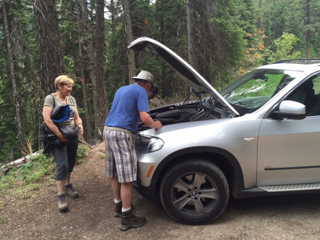 Ken called the Canadian equivalent of the AA and explained the problem.  The next problem for the AA was finding a garage who had a flat bed trailer and a four wheel drive to tackle the forestry road.   A flat bed trailer was required because you can’t tow a BMW.  Two families pulled up with quite big vehicles so we had a chat with them and they offered us a lift down if we didn’t get the problem resolved.  We carried on with our hike to the top.  There were a few phone calls back and forth with the AA and the consensus was that it may take a while to find someone with the appropriate vehicles and also someone who was willing to come up the Mount.