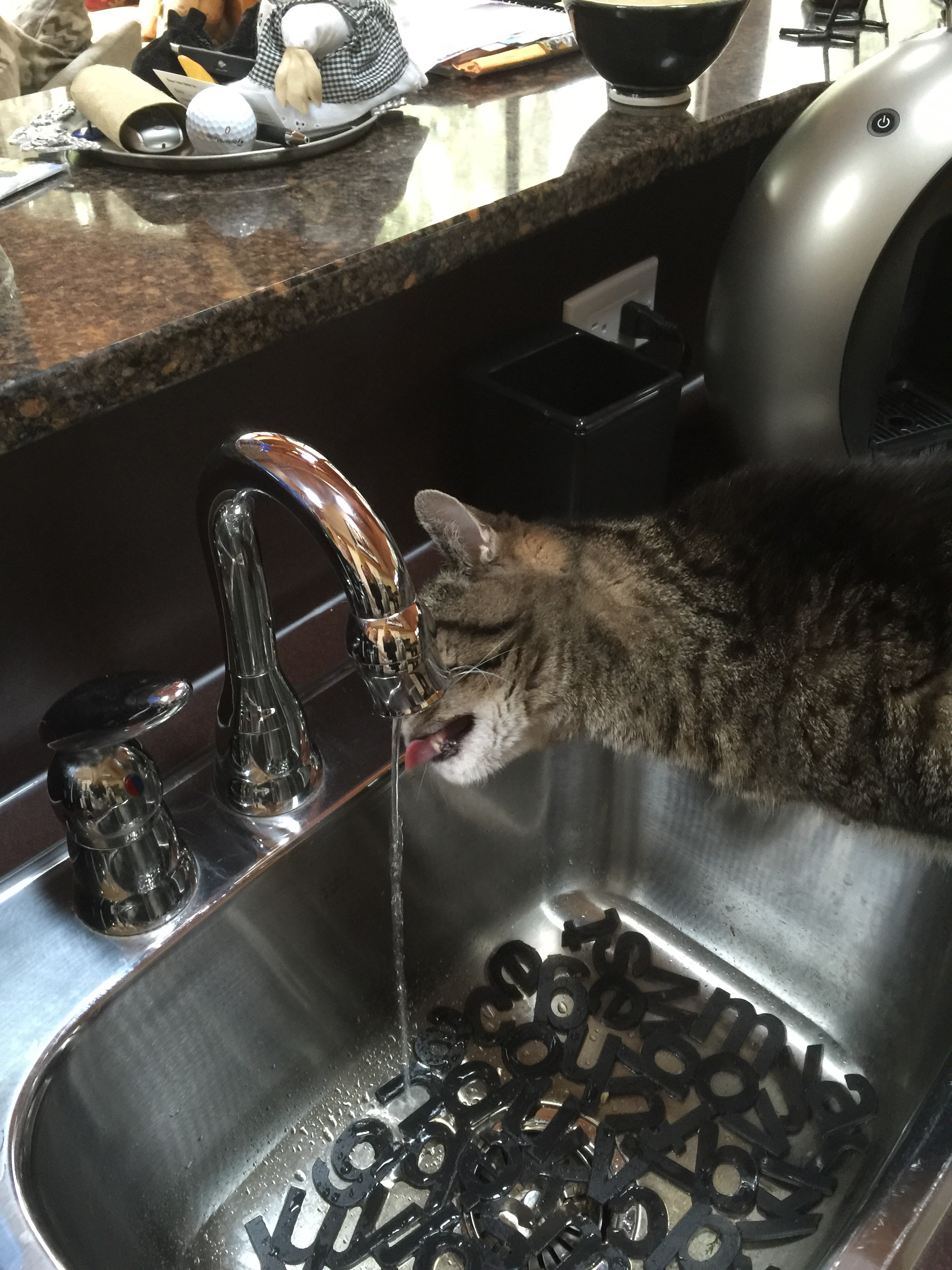 Smokey the cat having a drink – this is normal behaviour : ). Smokey spends his time between Calgary and Invermere.  The other interesting thing about Smokey is that he is a fulltime indoor cat.  He cannot go outside due to the threat of predators – bears, Cougars etc…  This is also normal practice in Canada.