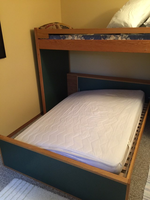 Steve was obviously dreaming about another trip to the hardware store so proceeded to break the bed and fall out at 2am that morning. I woke up to see him cast on all fours on the floor – I said what the heck happened there. The side arm had fallen off causing all the slats to go south. We turned the light on but didn’t think it was an easy fix at that hour of the night so decided Steve would sleep on my side and I would sleep on the top bunk. He had the cheek to say to me “make sure you only take one blanket”. I was the one venturing to the top bunk after he had broken the bed! I went back to sleep but dreamt that the top bunk fell on top of Steve – I was agonising over telling him to turn around and sleep with his head the other way. Funnily enough Steve had the same thoughts as he heard the top bunk creaking.