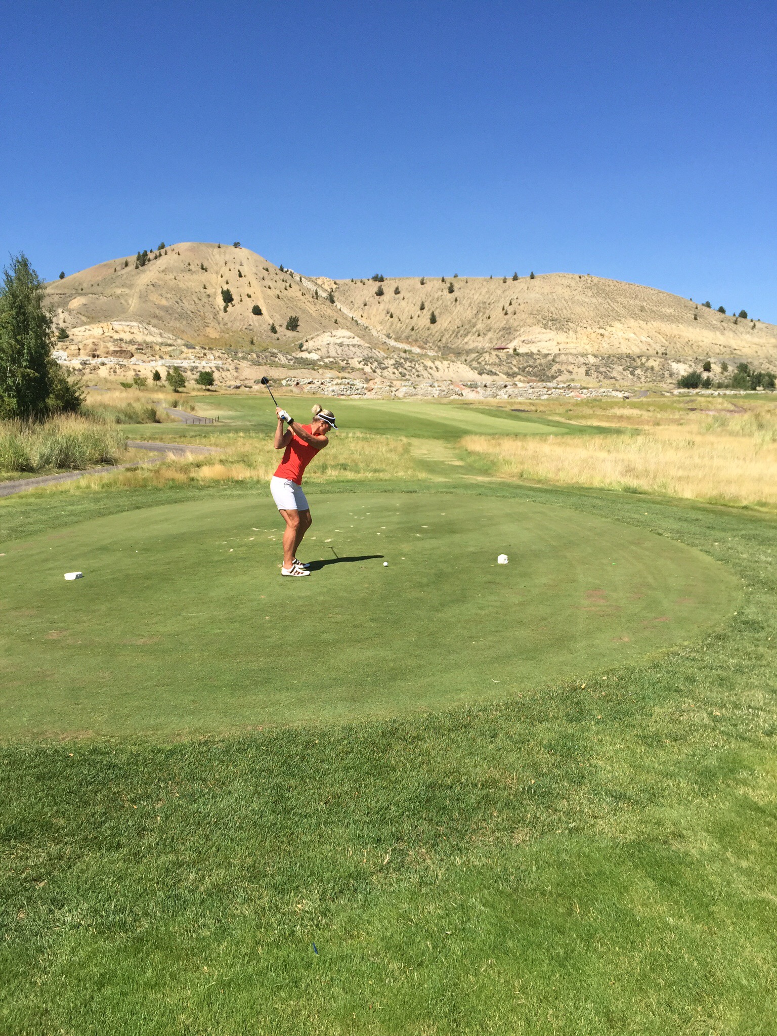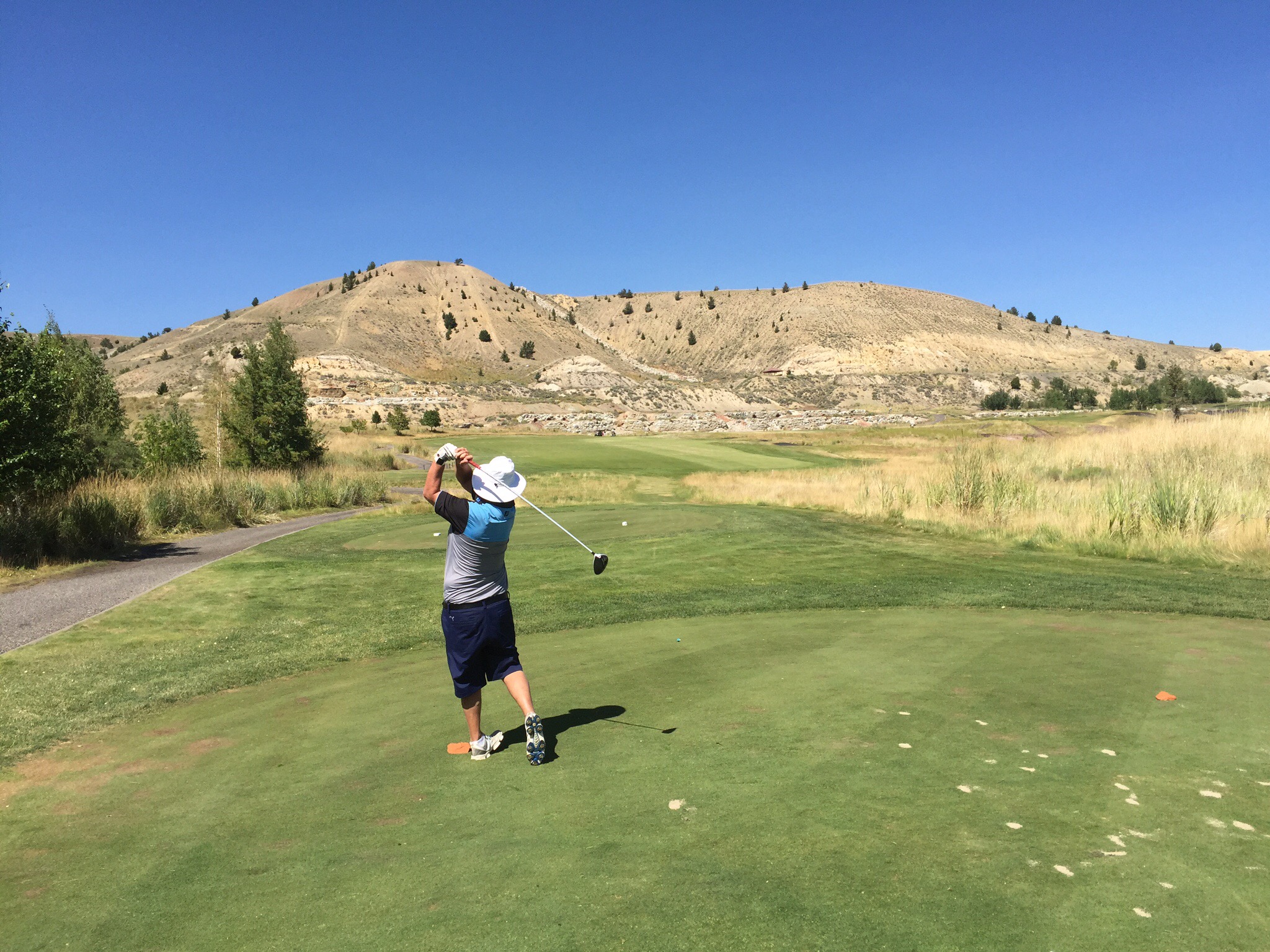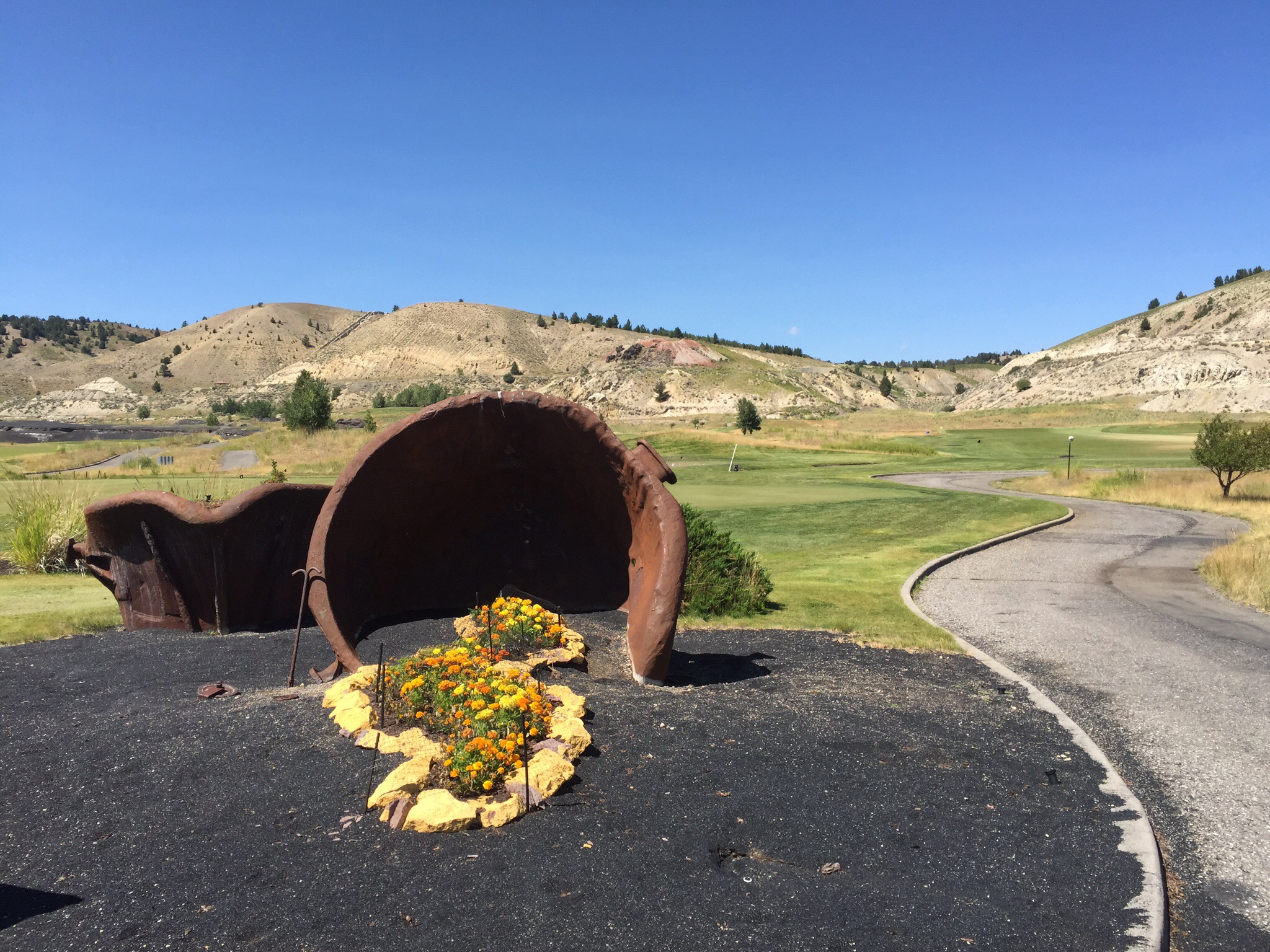 We travelled thirty minutes from Butte to Anaconda to play the Old Works Golf Course which is a Jack Nicklaus Signature design. Like a Phoenix rising from the ashes, the Old Works Golf Course has been reborn on the site of Anaconda’s historic century old copper smelter. Jack Nicklaus incorporated many historic relics in his Signature design.
