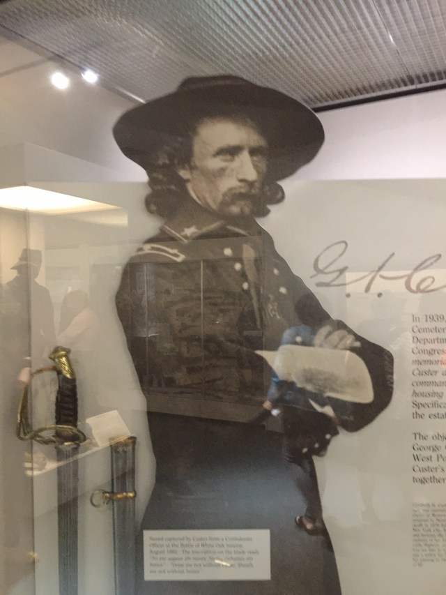 The marble headstone with the black emblem on it is where General Custer was slain.