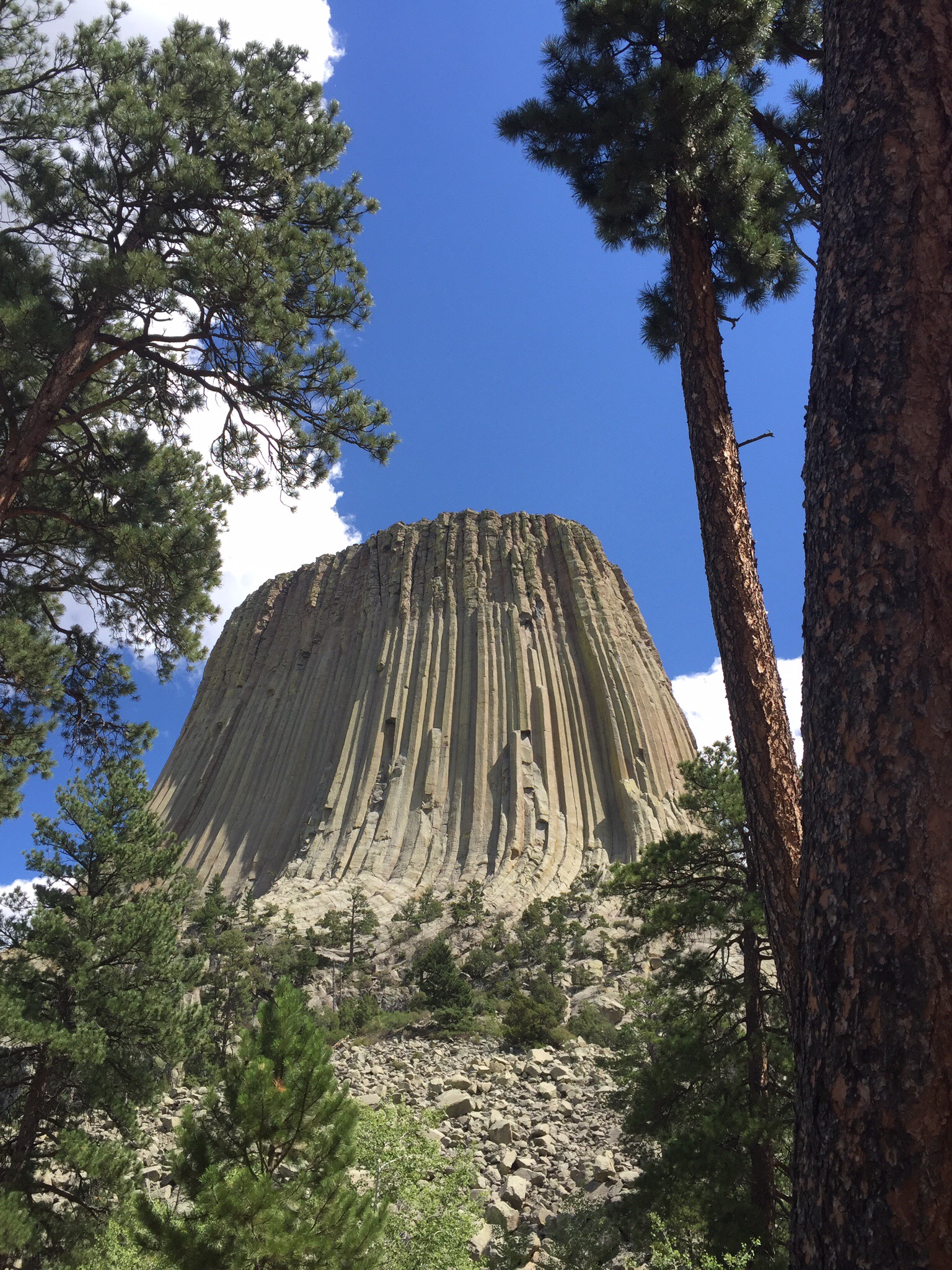 About 50 million years ago molten magma was forced into sedimentary rocks above it and cooled underground. As it cooled it contracted and fractured into columns. An earlier flow formed Little Missouri Buttes. Over millions of years, erosion of the sedimentary rock exposed Devil’s Tower and accentuated Little Missouri Buttes. The tower rises 867 feet from its base and stands 1,267 feet above the river and 5,112 feet above sea level. The area of its teardrop shaped top is 1.5 acres. The diameter of its base is 1,000 feet.